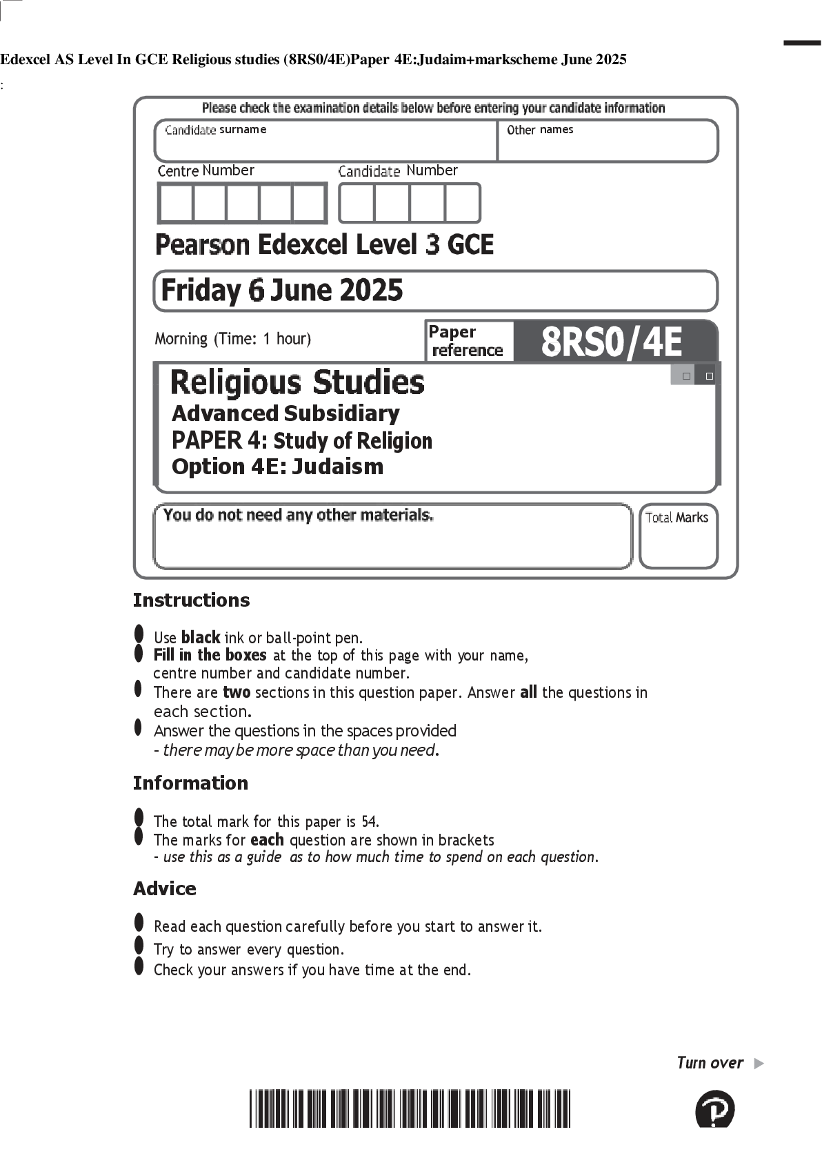 Religious Studies > Edexcel > Edexcel AS Level In GCE Religious studies (8RS0/4E)Paper 4E:Judaim+markscheme June 2025 (All)