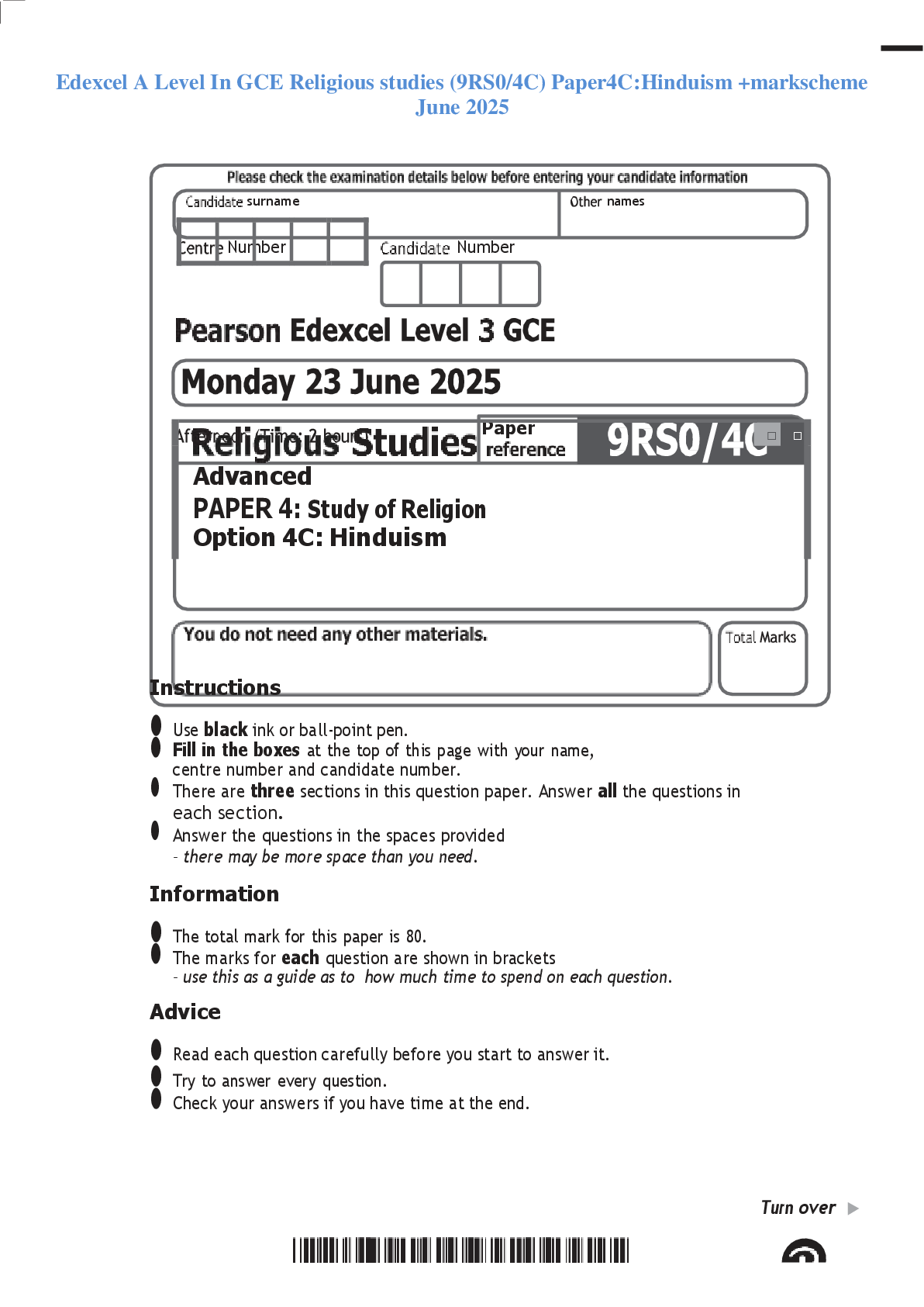 Religious Studies > Edexcel > Edexcel A Level In GCE Religious studies (9RS0/4C) Paper4C:Hinduism +markscheme June 2025 (All)