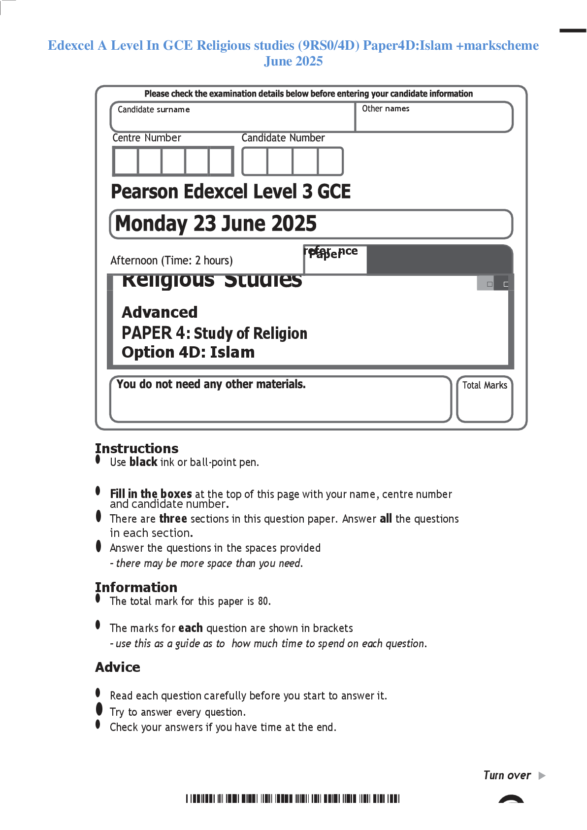 Religious Studies > Edexcel > Edexcel A Level In GCE Religious studies (9RS0/4D) Paper4D:Islam +markscheme June 2025 (All)