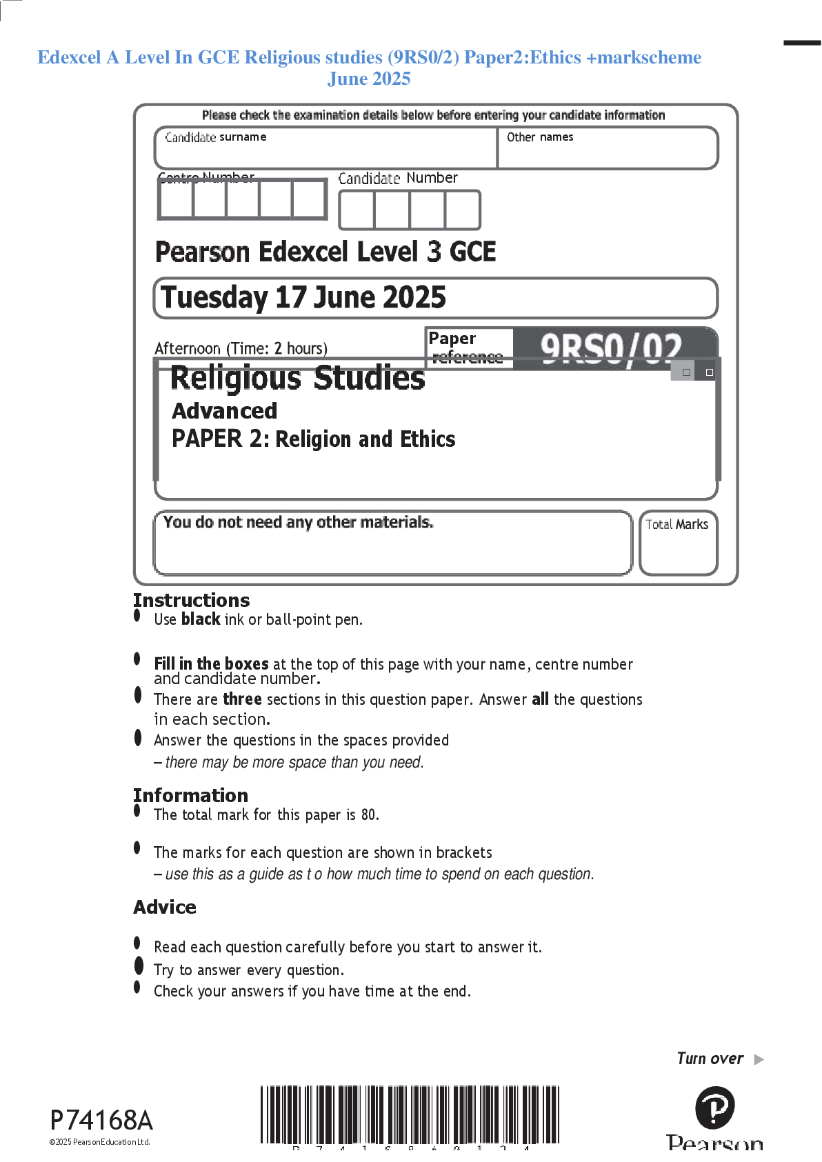 Religious Studies > Edexcel > Edexcel A Level In GCE Religious studies (9RS0/2) Paper2:Ethics +markscheme June 2025 (All)