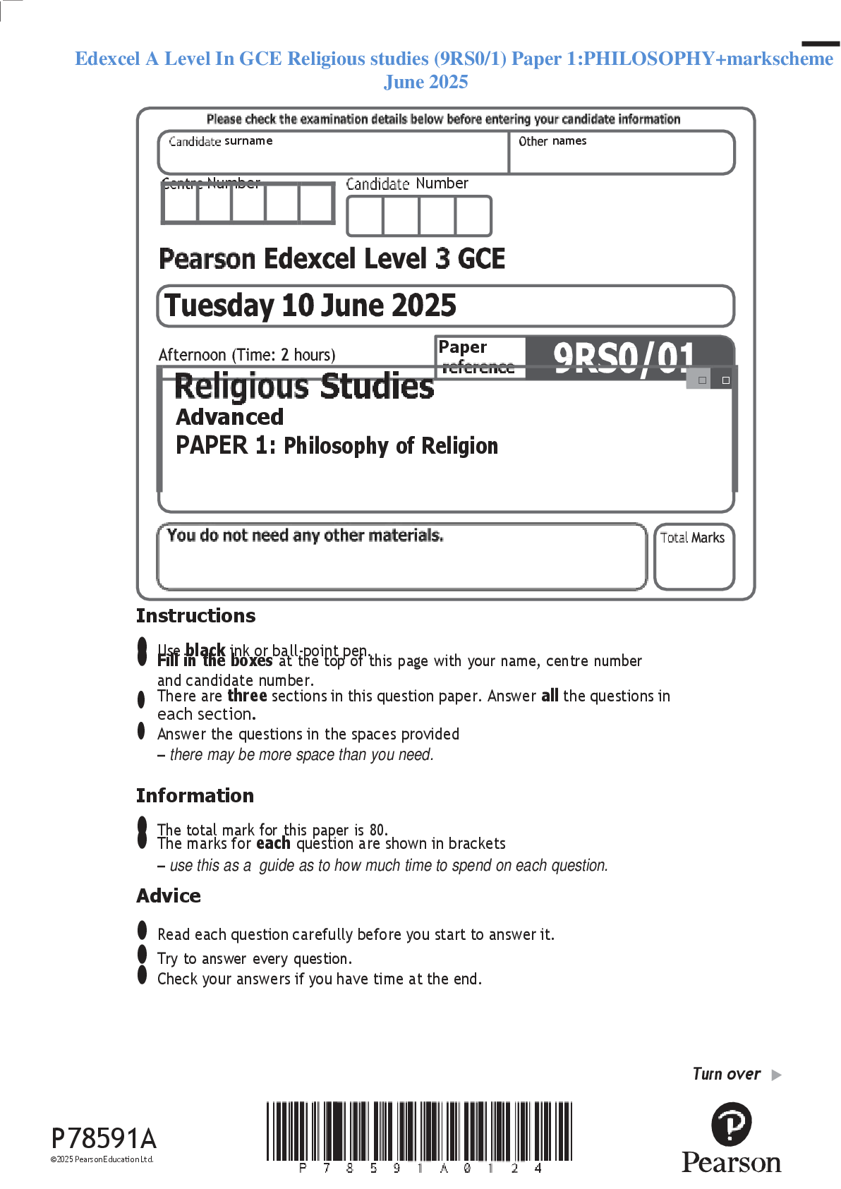 Religious Studies > Edexcel > Edexcel A Level In GCE Religious studies (9RS0/1) Paper 1:PHILOSOPHY+markscheme June 2025 (All)