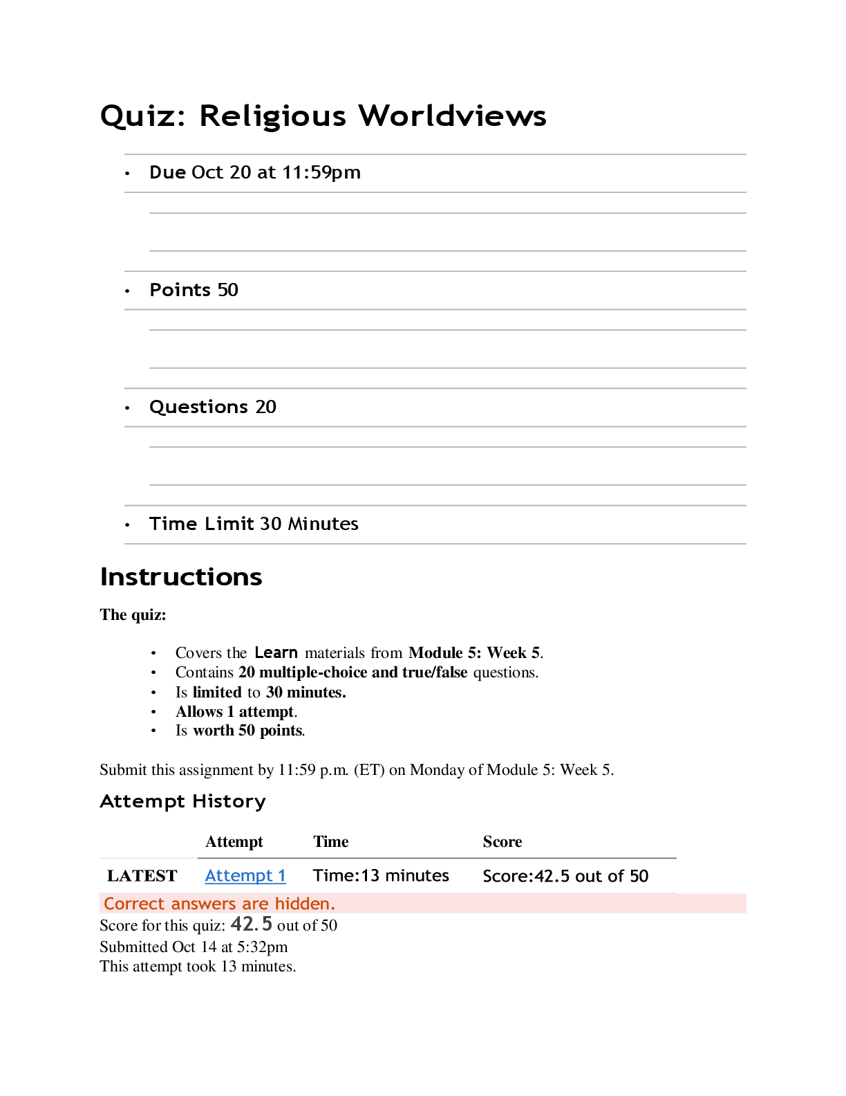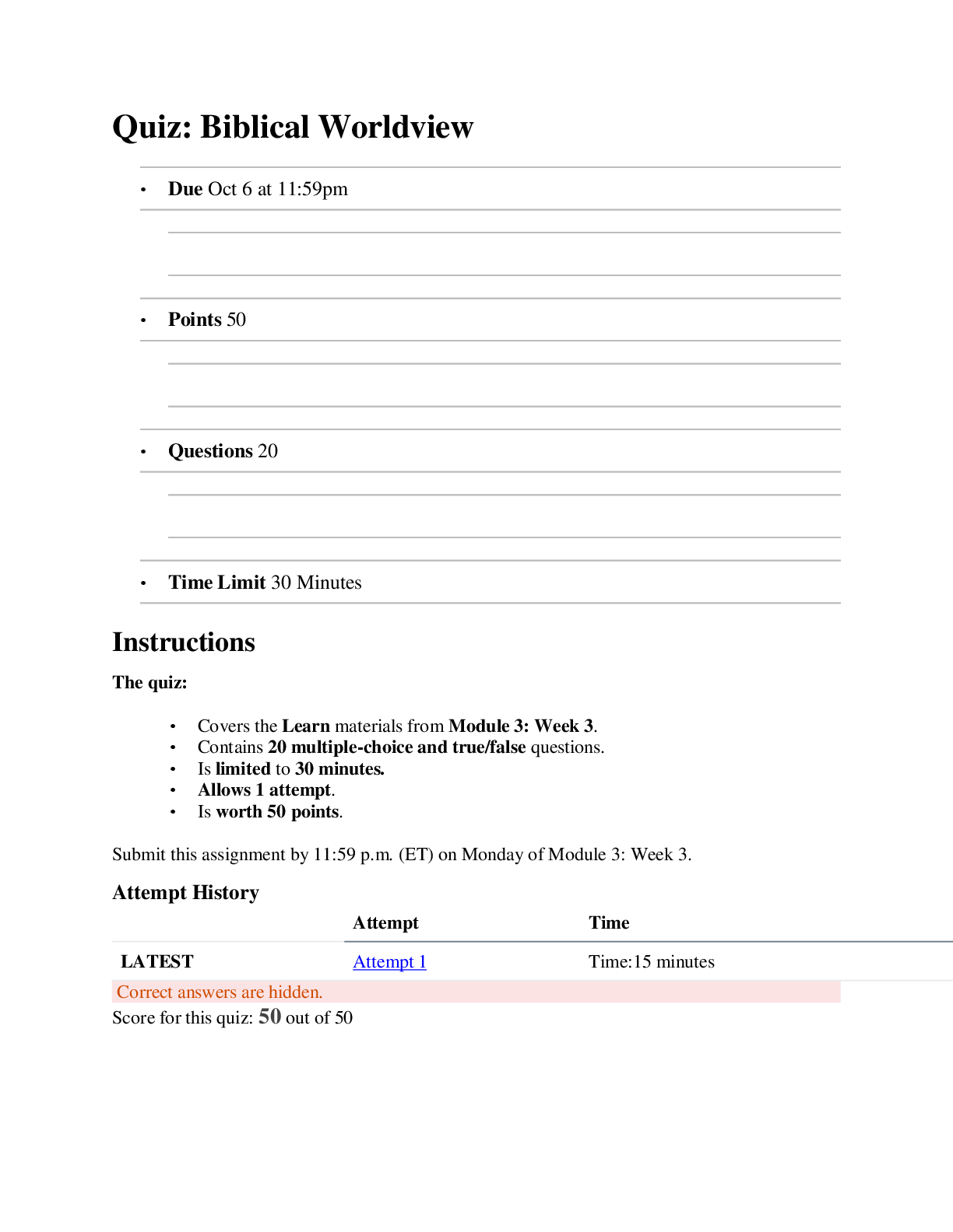 Religious Studies > EXAMs > RLGN 104 Quiz: Biblical Worldview | Score 50/50 | Liberty University (All)