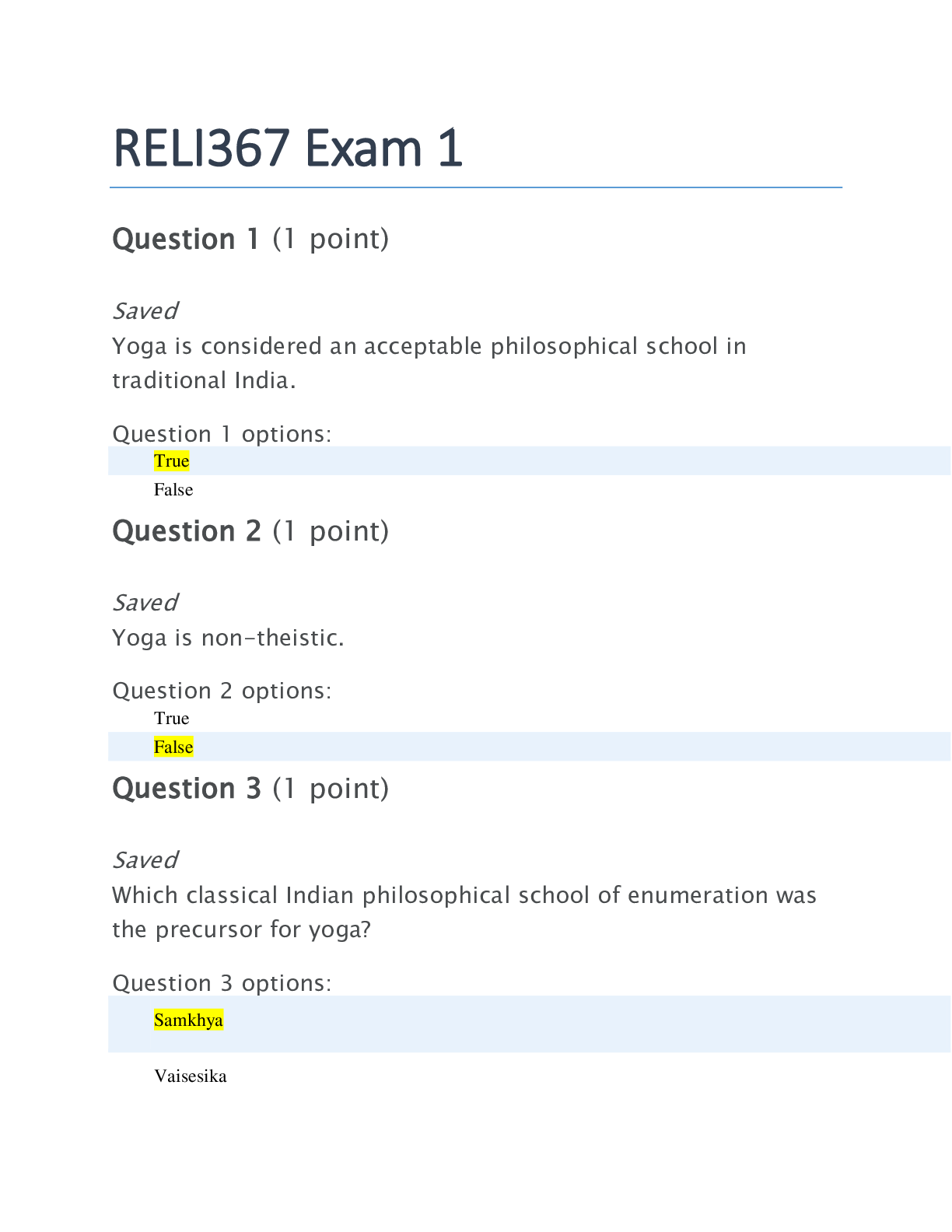 Religious Studies > EXAMs > RELI 367 Yoga Exam 1. Scored 100%. University of Arizona. (All)