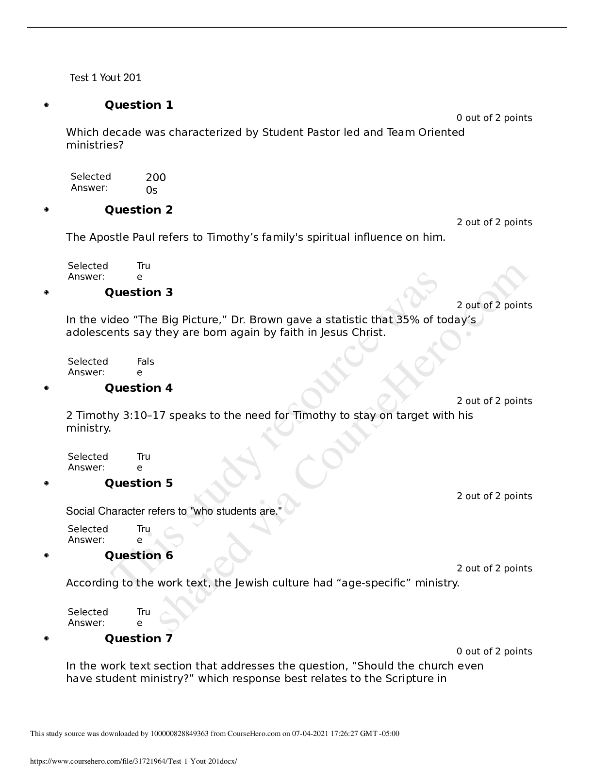 Religious Studies > QUESTIONS & ANSWERS > RLGN 105 Test 5 Liberty University Set 1, 2021 all answers correct. (All)