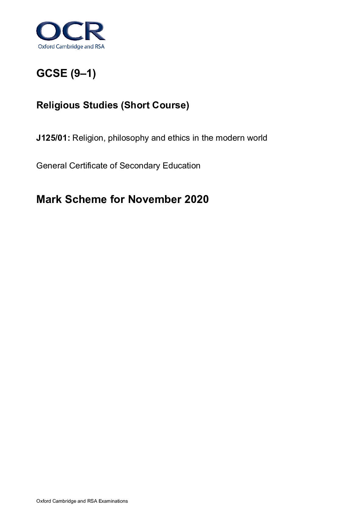 Religious Studies > MARK SCHEMES > GCSE (9–1) Religious Studies (Short Course) J125/01: Religion, philosophy and ethics in the modern world General Certificate of Secondary Education Mark Scheme for November 2020 (All)