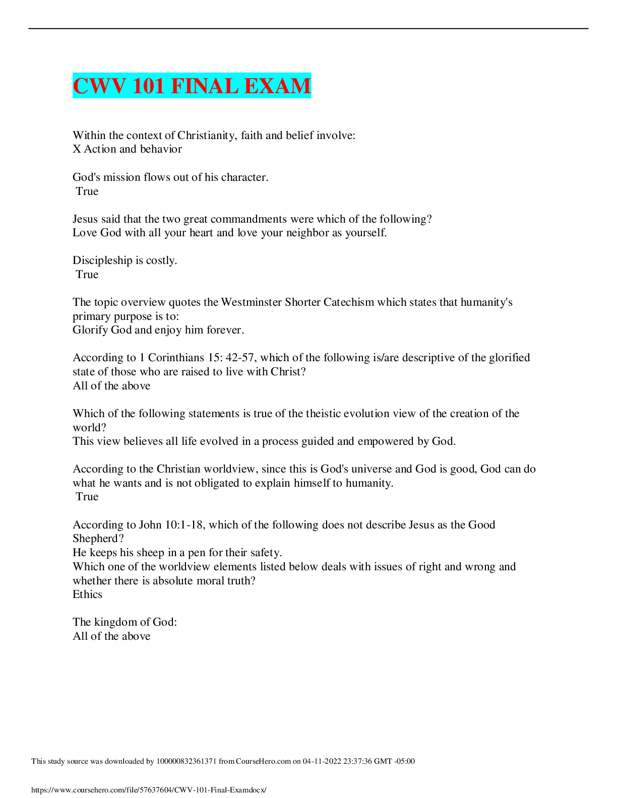 Religious Studies > EXAM > CWV 101 FINAL EXAM (All)