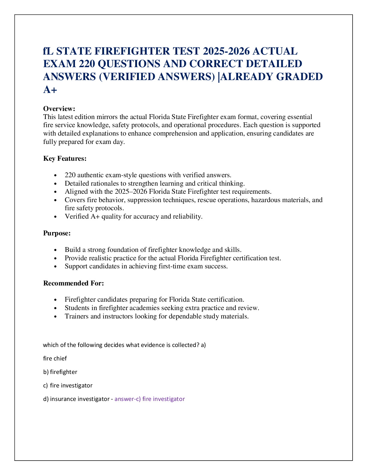 FIRE INSPECTOR > EXAMs > fL STATE FIREFIGHTER TEST 2025-2026 ACTUAL EXAM 220 QUESTIONS AND CORRECT DETAILED ANSWERS (VERIFIED ANSWERS) |ALREADY GRADED A+ (All)