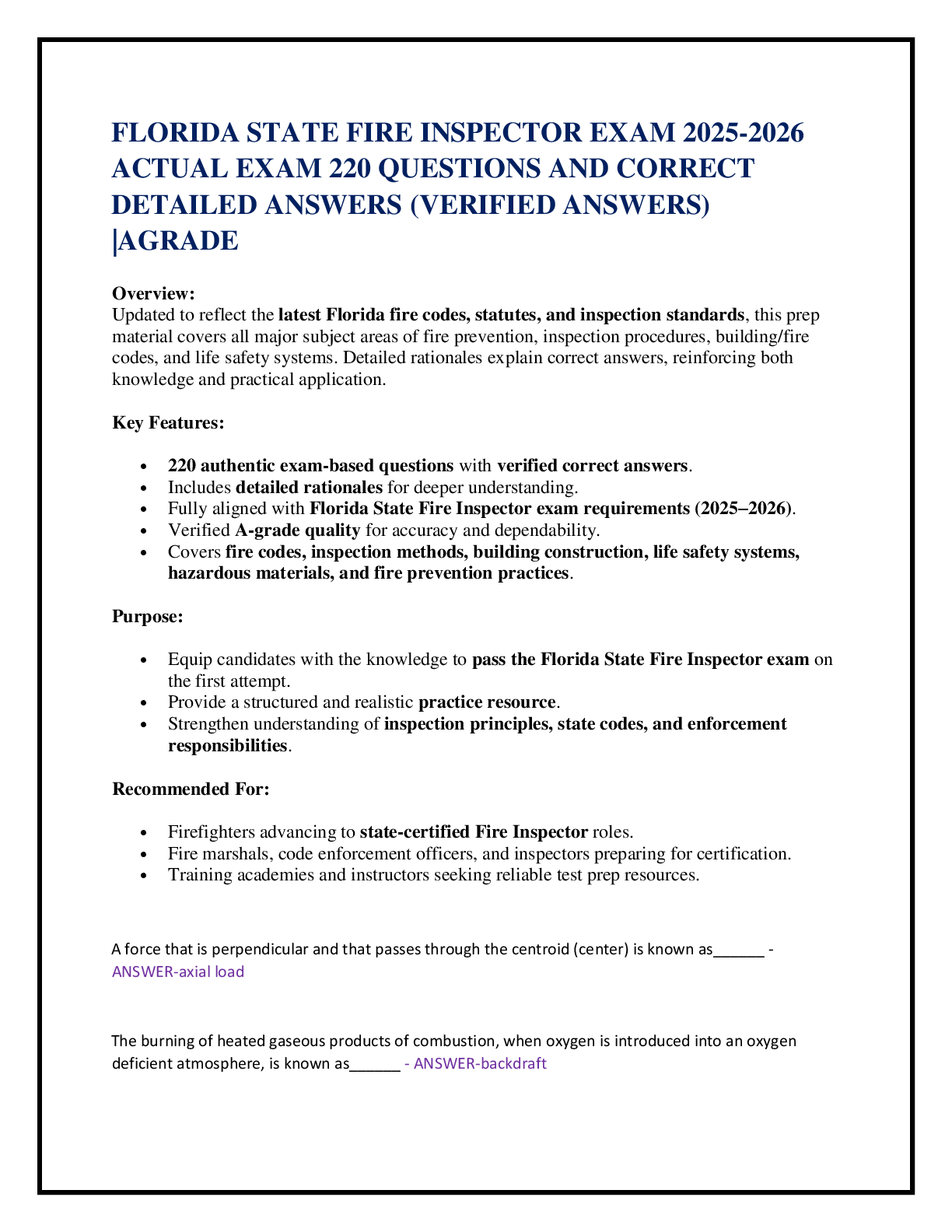 FIRE INSPECTOR > EXAMs > FLORIDA STATE FIRE INSPECTOR EXAM 2025-2026 ACTUAL EXAM 220 QUESTIONS AND CORRECT DETAILED ANSWERS (VERIFIED ANSWERS) |AGRADE (All)