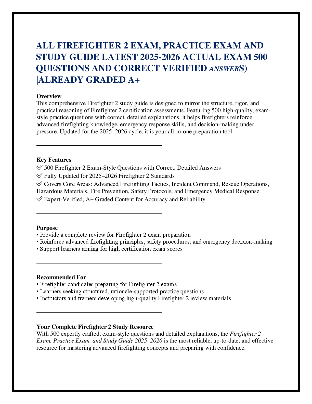 Fire Inspector 2 > EXAMs > ALL FIREFIGHTER 2 EXAM, PRACTICE EXAM AND STUDY GUIDE LATEST 2025-2026 ACTUAL EXAM 500 QUESTIONS AND CORRECT VERIFIED ANSWERS) |ALREADY GRADED A+ (All)