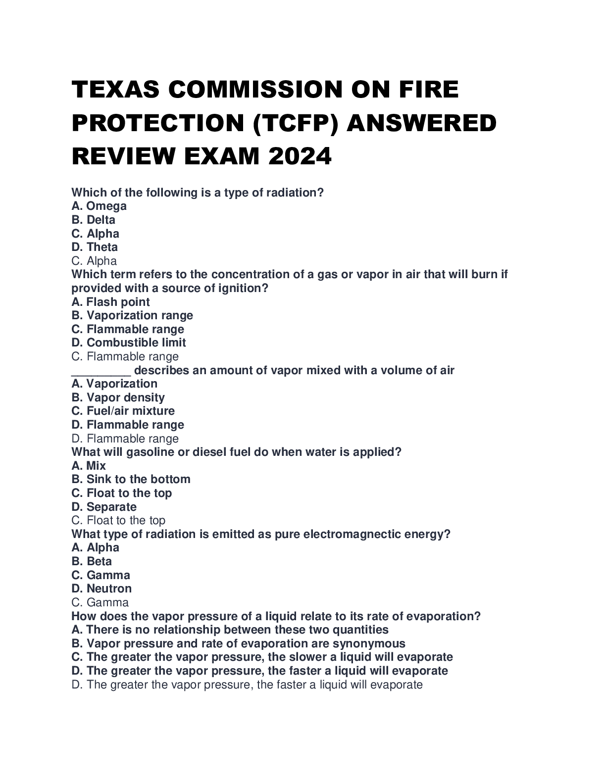 TCFP FIRE INSPECTOR > EXAM > (TCFP) TEXAS COMMISSION ON FIRE PROTECTION ANSWERED REVIEW EXAM 2024 (All)