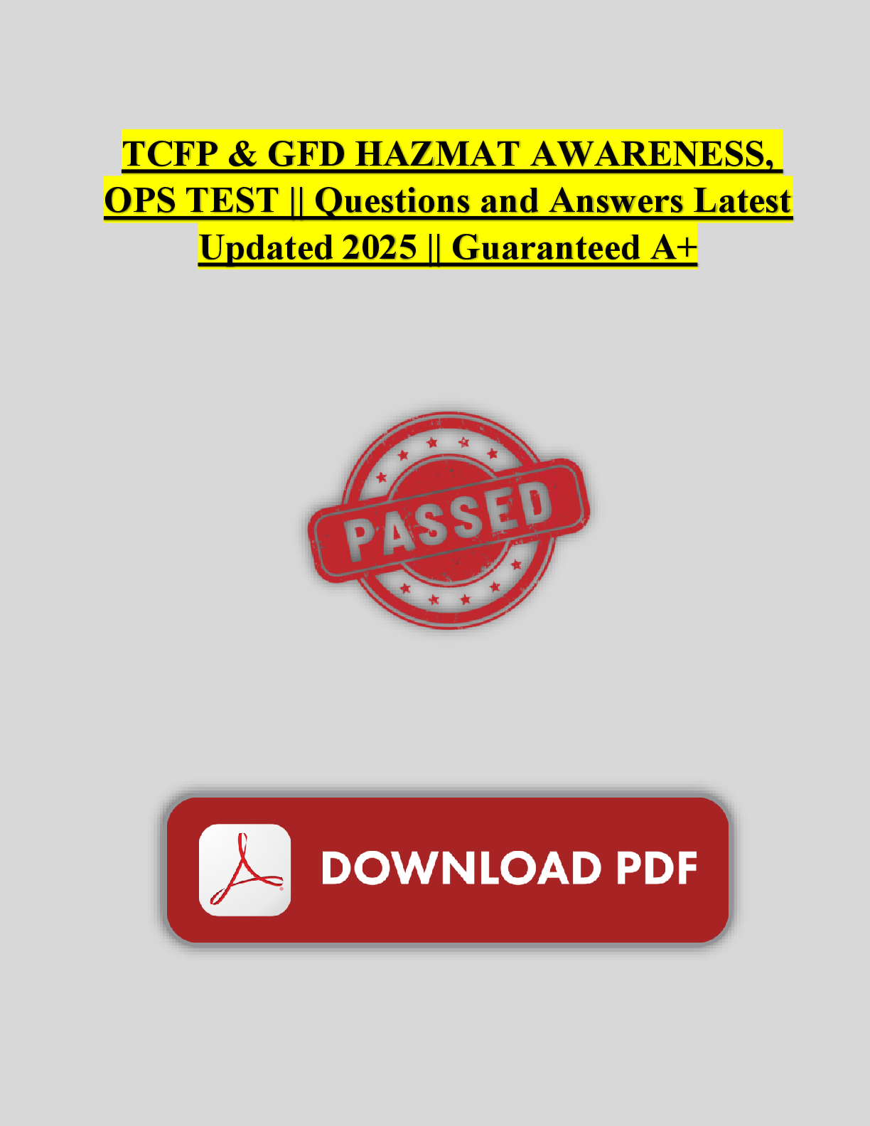 TCFP FIRE INSPECTOR > EXAM > TCFP & GFD HAZMAT AWARENESS, OPS TEST || Questions and Answers Latest Updated 2025 || Guaranteed A+ (All)