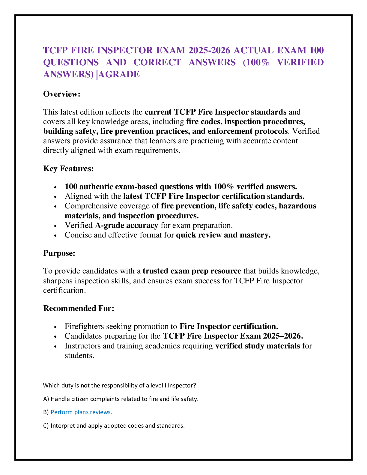 TCFP FIRE INSPECTOR > EXAM > TCFP FIRE INSPECTOR EXAM 2025-2026 ACTUAL EXAM 100 QUESTIONS AND CORRECT ANSWERS (100% VERIFIED ANSWERS) |AGRADE (All)