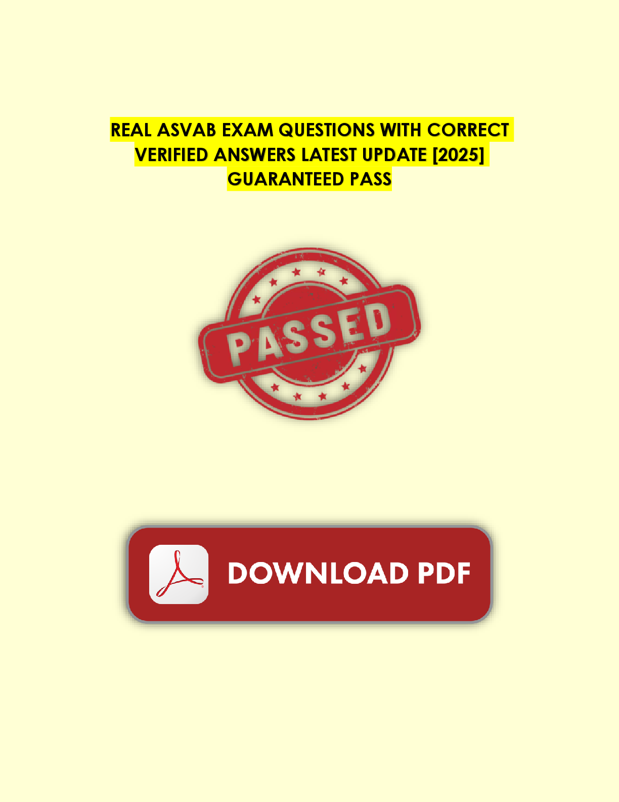 PICAT/ASVAB > EXAM > ASVAB, REAL ASVAB TEST || ACTUAL TEST EXAM ALL QUESTIONS AND 100% CORRECT ANSWER ALREADY GRADED A+ || LATEST AND COMPLETE UPDATE 2025 WITH VERIFIED SOLUTIONS || ASSURED PASS!!! (All)