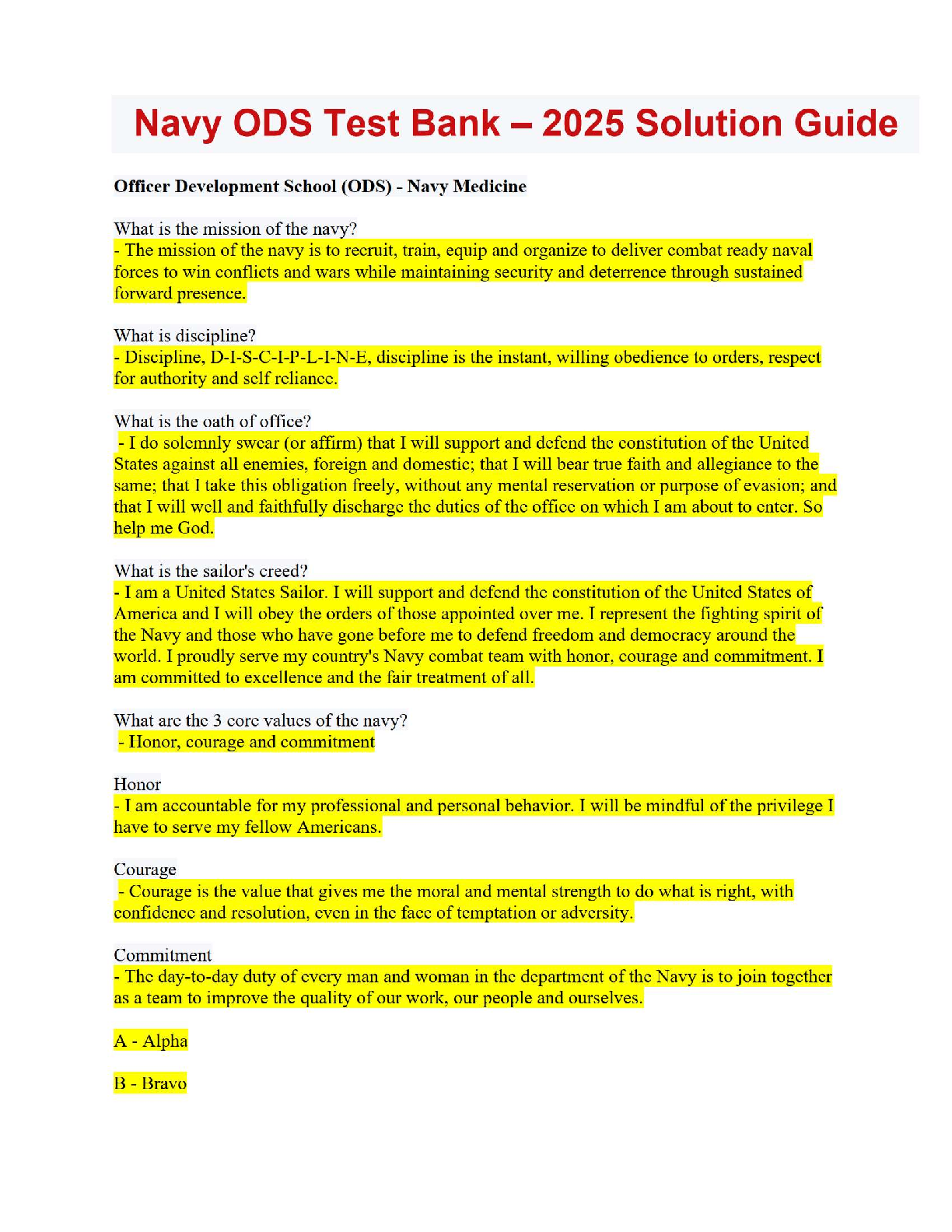 PICAT PRE-ASVAB GO NAVY > SOLUTIONS > Navy ODS Test Bank – 2025 Solution Guide (All)