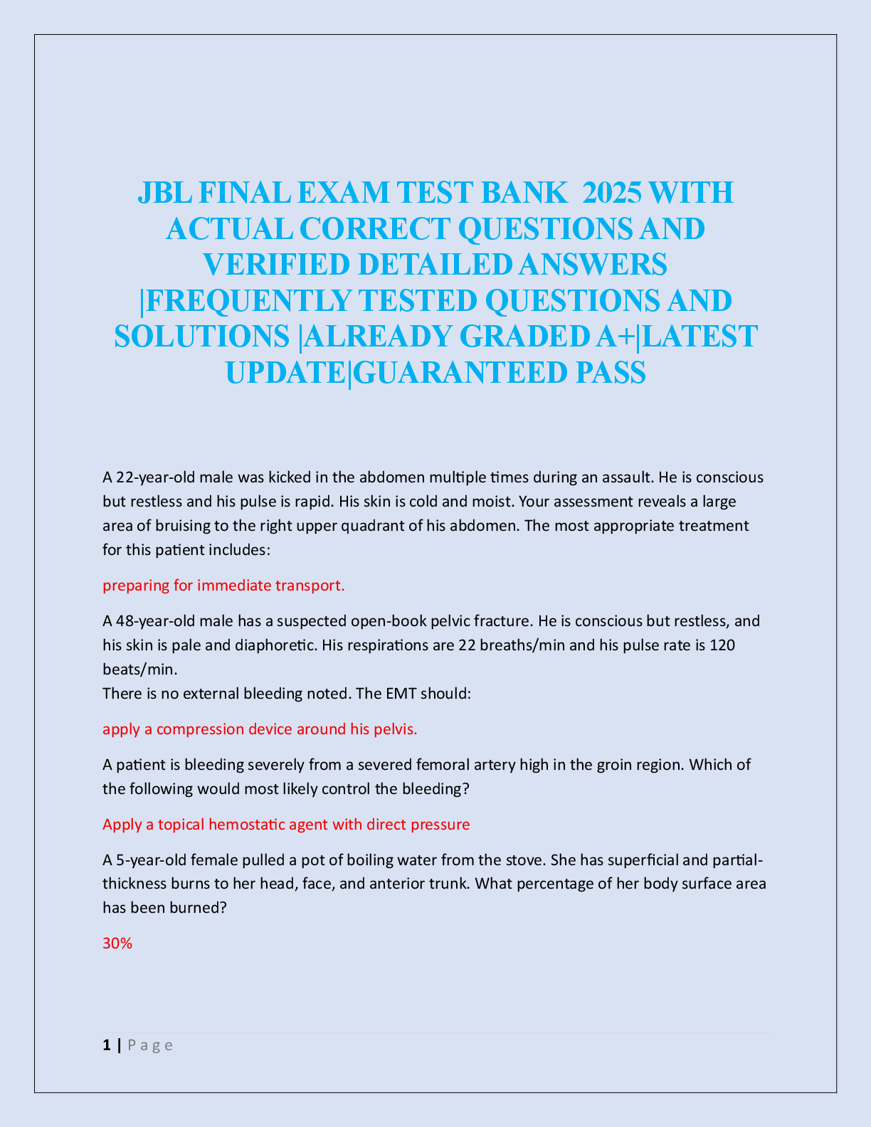 EMT-B - Emergency Medical Technician - Basic > EXAM > JBL FINAL EXAM TEST BANK 2025 (All)