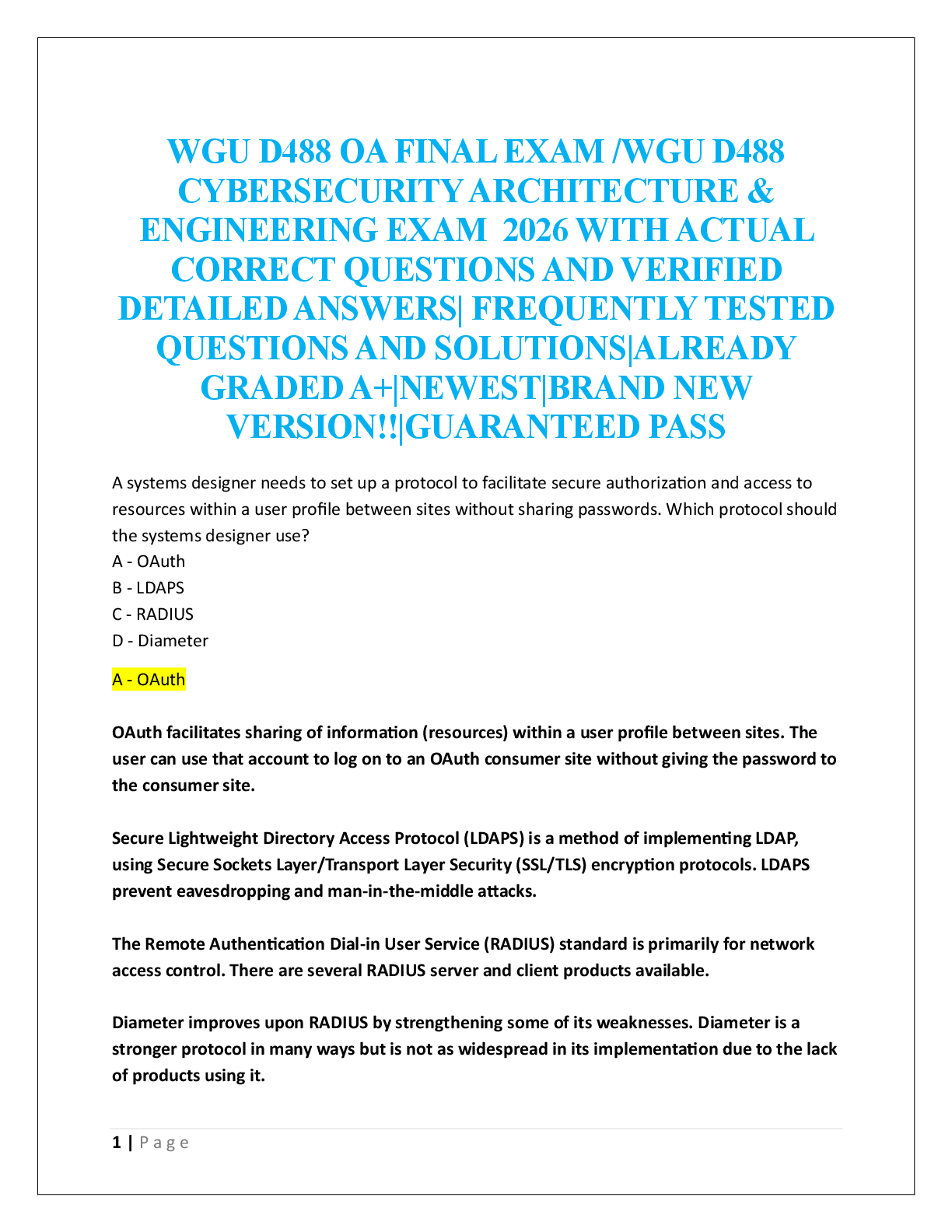 CyberArk Defender and Sentry > EXAM > WGU D488 OA FINAL EXAM TEST BANK /WGU D488 CYBERSECURITY ARCHITECTURE & ENGINEERING EXAM 2026 (All)