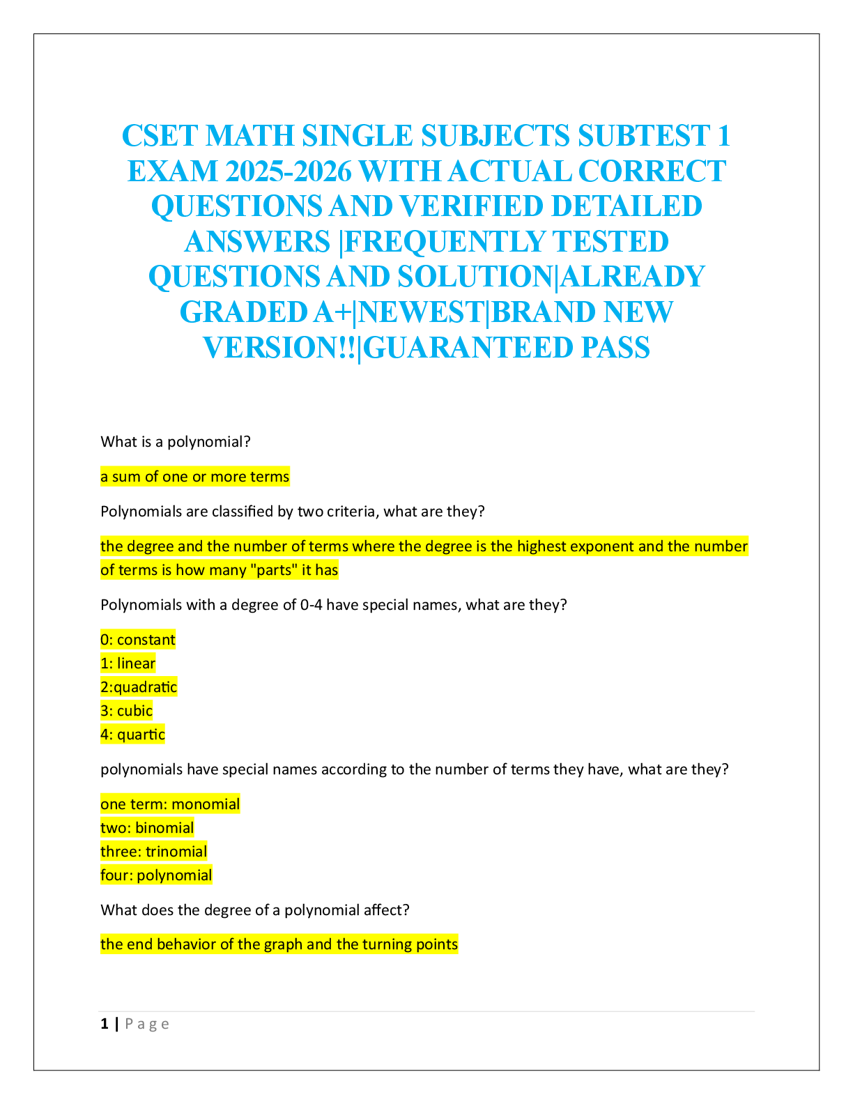 NES Elementary Education > EXAMs > CSET MATH SINGLE SUBJECTS SUBTEST 1 EXAM (All)