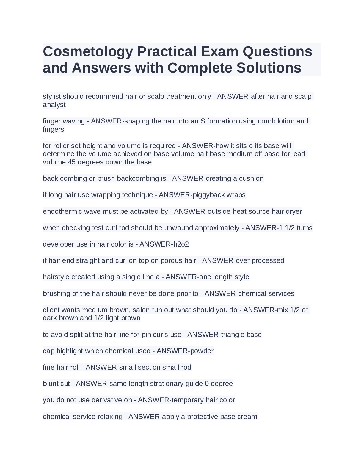 Cosmetology > EXAM > Cosmetology Practical Exam Questions with Complete Solutions 2023 (All)