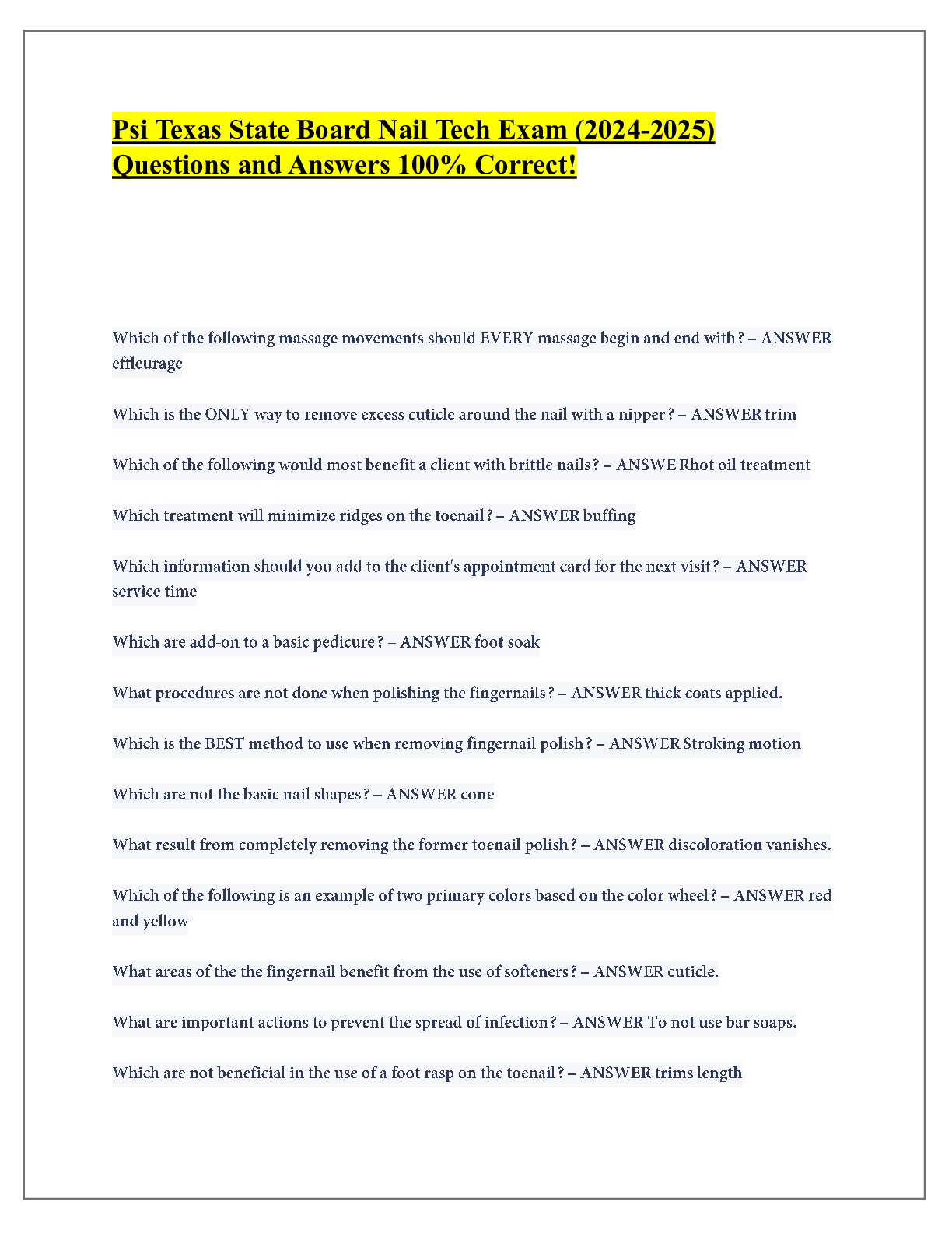 Cosmetology > EXAM > Psi Texas State Board Nail Tech Exam (2024|2025) Questions and Answers 100% Correct! (All)