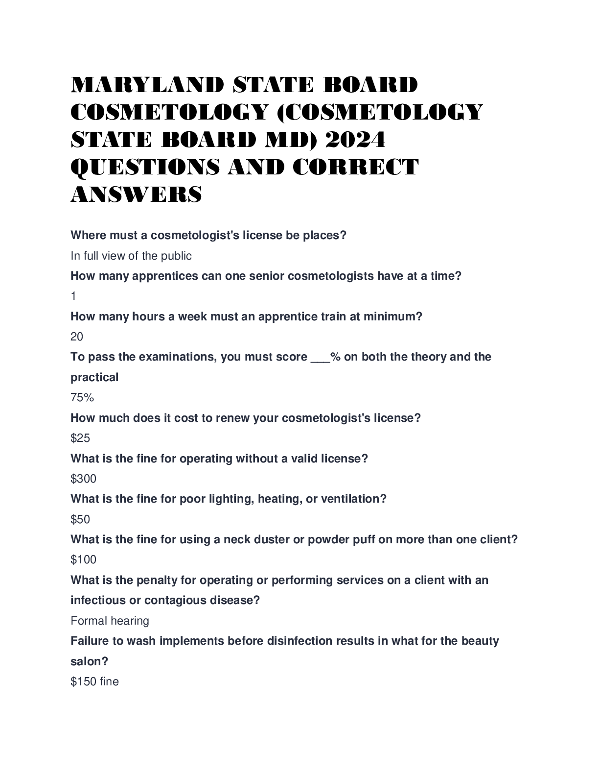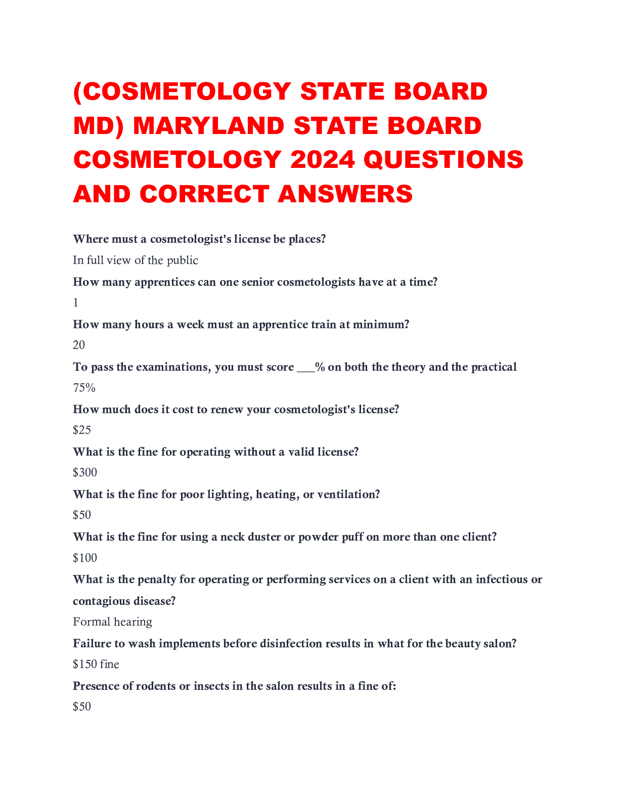 Cosmetology > EXAM > (COSMETOLOGY STATE BOARD MD) MARYLAND STATE BOARD COSMETOLOGY 2024 QUESTIONS AND CORRECT ANSWERS (All)