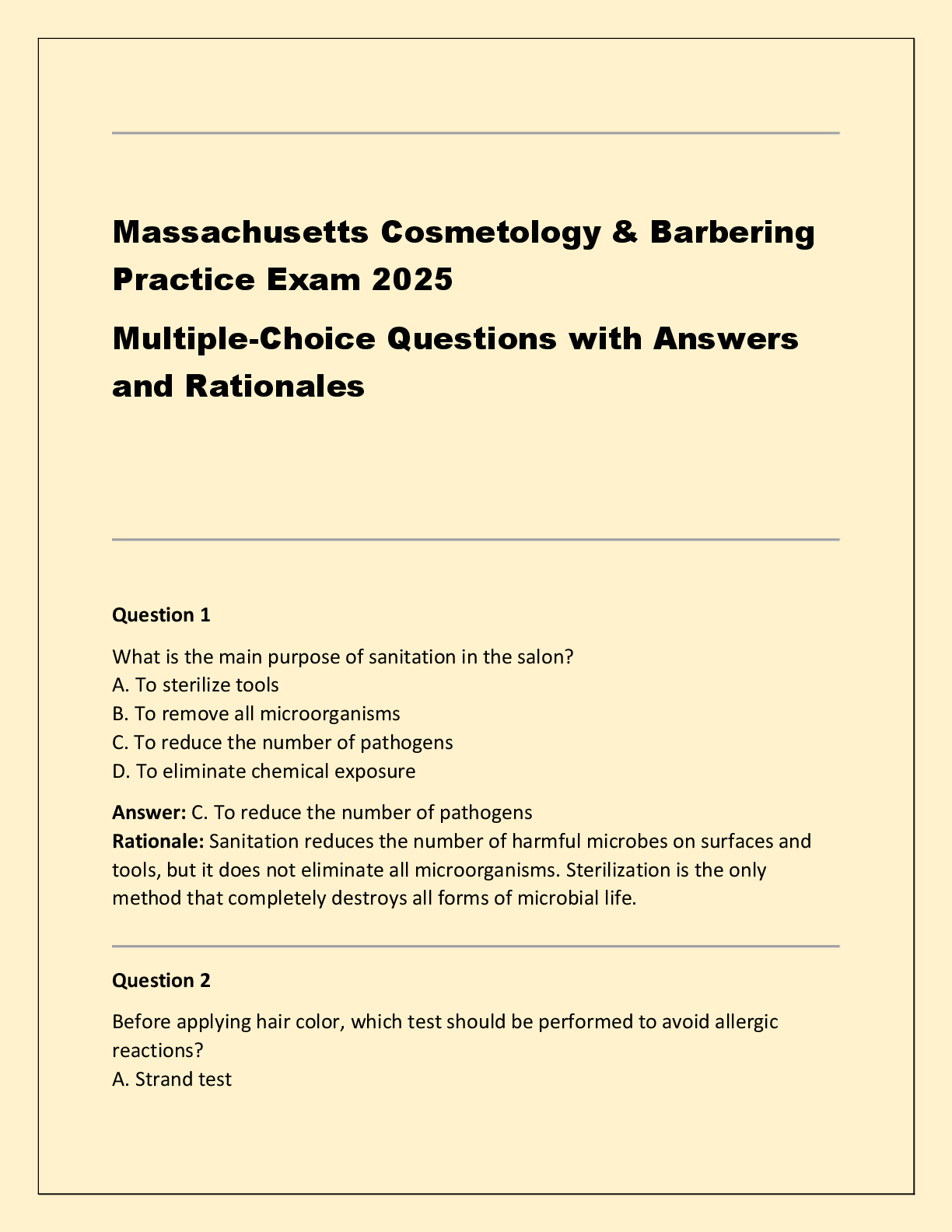 Cosmetology > EXAM > Massachusetts Cosmetology & Barbering Practice Exam 2025 Multiple-Choice Questions with Answers and Rationales (All)