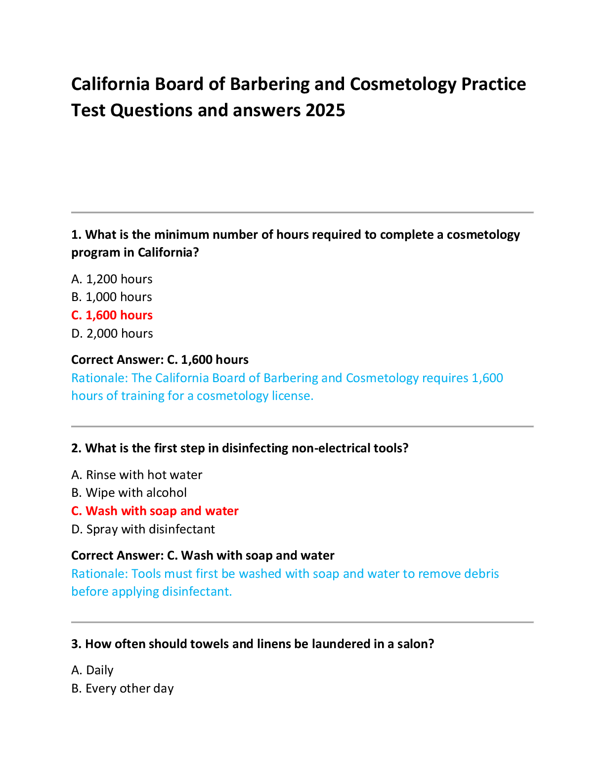 Cosmetology > EXAM > Cosmetology & Barber State Board Practice Exam Questions and correct Answers (Verified Answers) 2025 Format: Multiple Choice Answers: Bolded with Rationales (All)