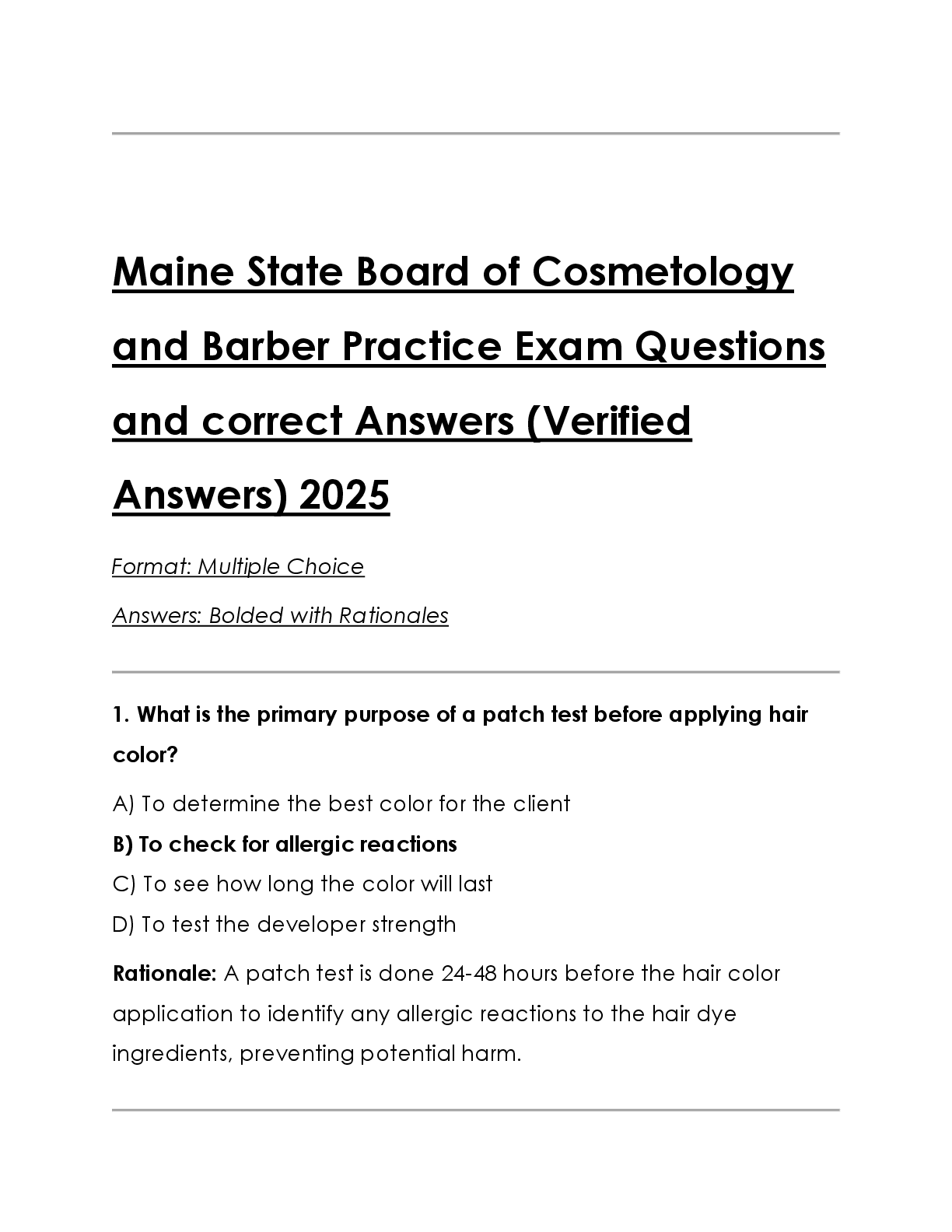 Cosmetology > EXAM > Maine State Board of Cosmetology and Barber Practice Exam Questions and correct Answers (Verified Answers) 2025 Format: Multiple Choice Answers: Bolded with Rationales (All)
