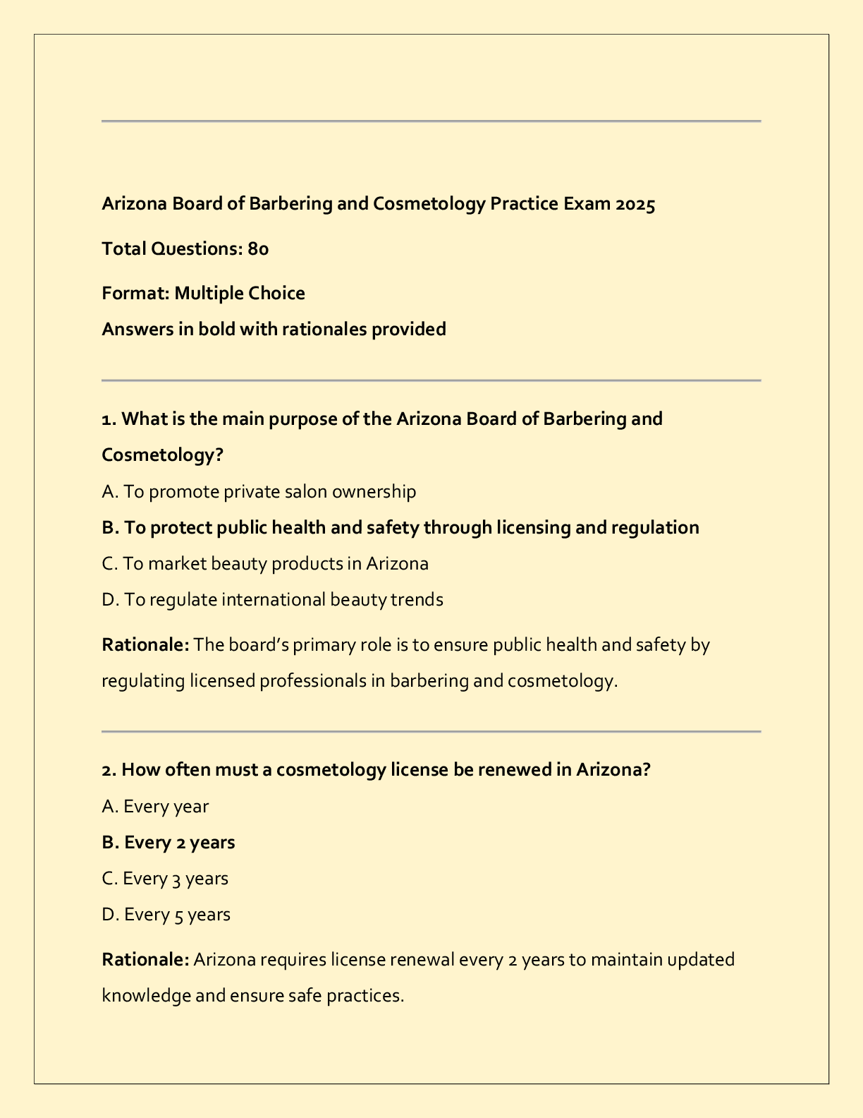 Cosmetology > EXAM > Arizona Board of Barbering and Cosmetology Practice Exam 2025 Total Questions: 80 Format: Multiple Choice Answers in bold with rationales provided (All)