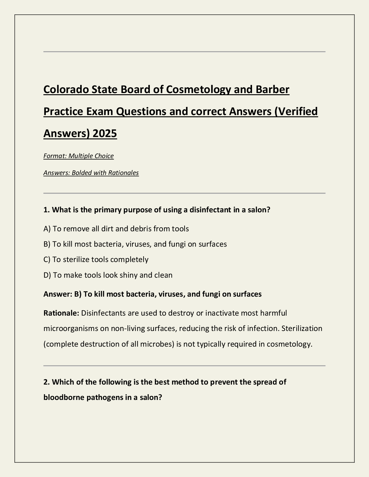 Cosmetology > EXAM > Colorado State Board of Cosmetology and Barber Practice Exam Questions and correct Answers (Verified Answers) 2025 Format: Multiple Choice Answers: Bolded with Rationales (All)