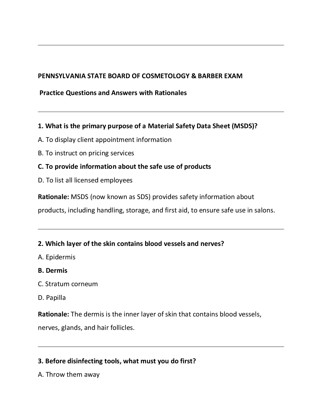 Cosmetology > EXAM > PENNSYLVANIA STATE BOARD OF COSMETOLOGY & BARBER EXAM Practice Questions and Answers with Rationales (All)