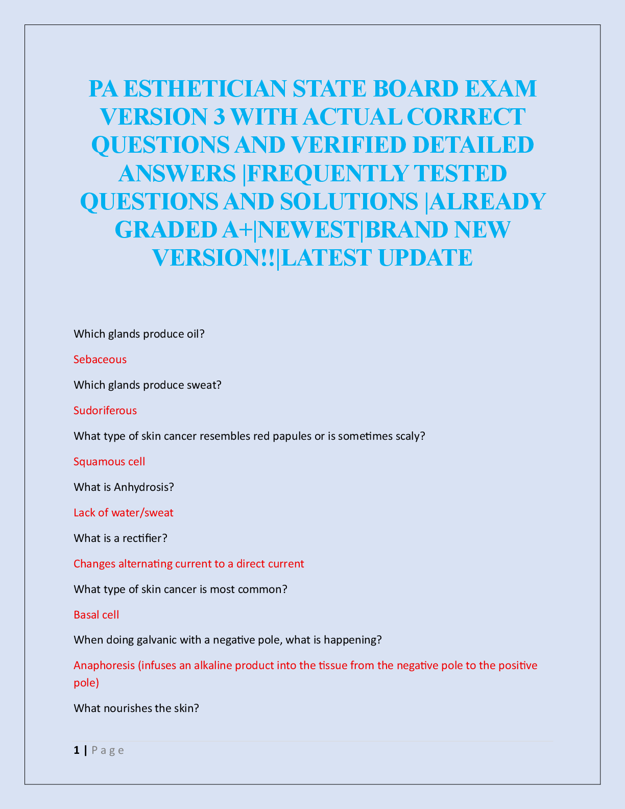 Cosmetology > EXAM > PA ESTHETICIAN STATE BOARD EXAM VERSION 3 (All)
