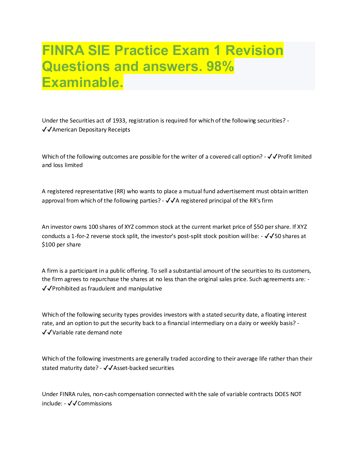 Management > QUESTIONS & ANSWERS > FINRA SIE Practice Exam 1 Revision Questions and answers. 98% Examinable. (All)