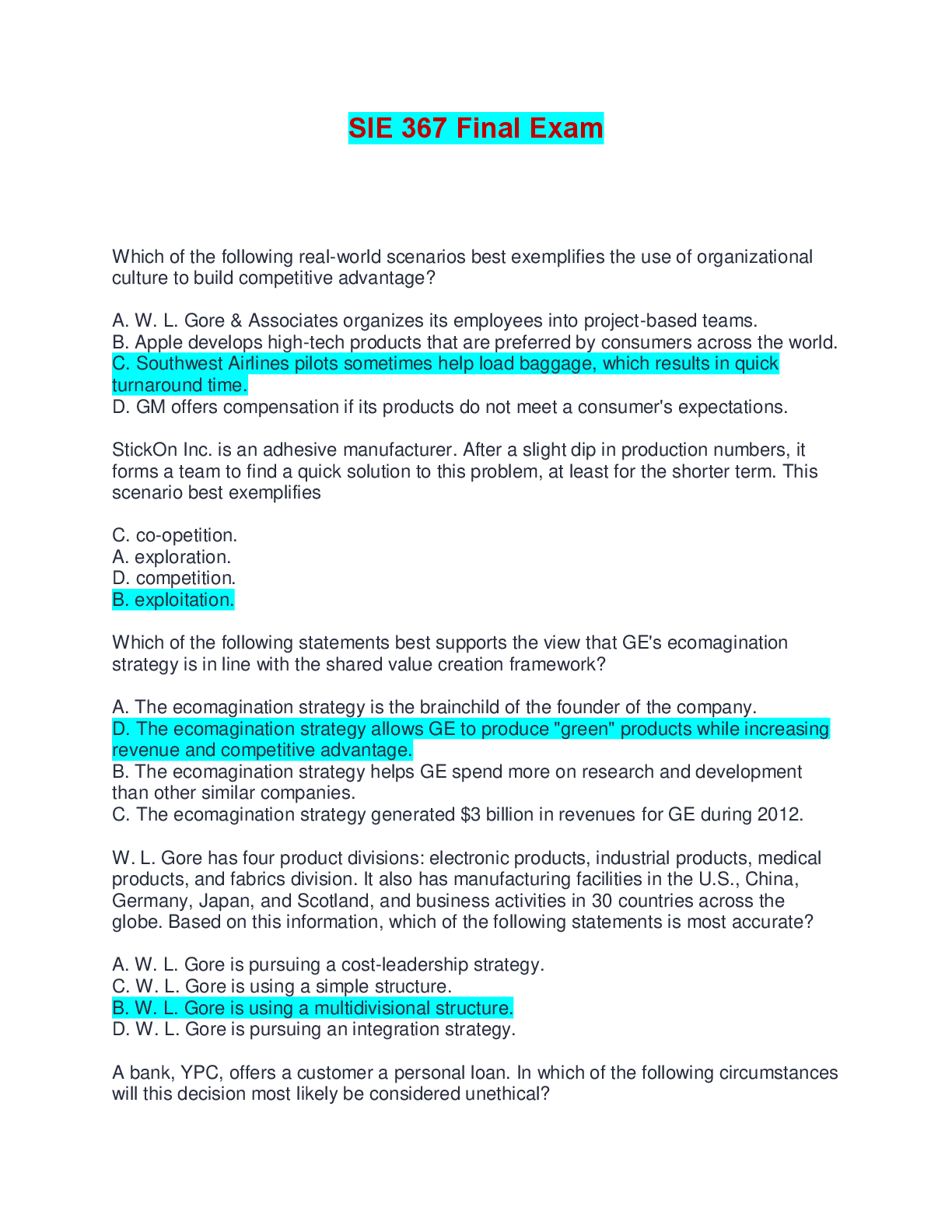 Management > EXAM > SIE 367 Final Exam | Complete Solutions (Verified Answers) (All)