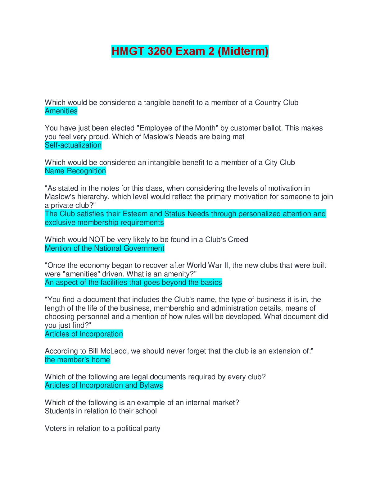 Management > EXAM > HMGT 3260 Exam 2 (Midterm) | Questions and Answers (All)