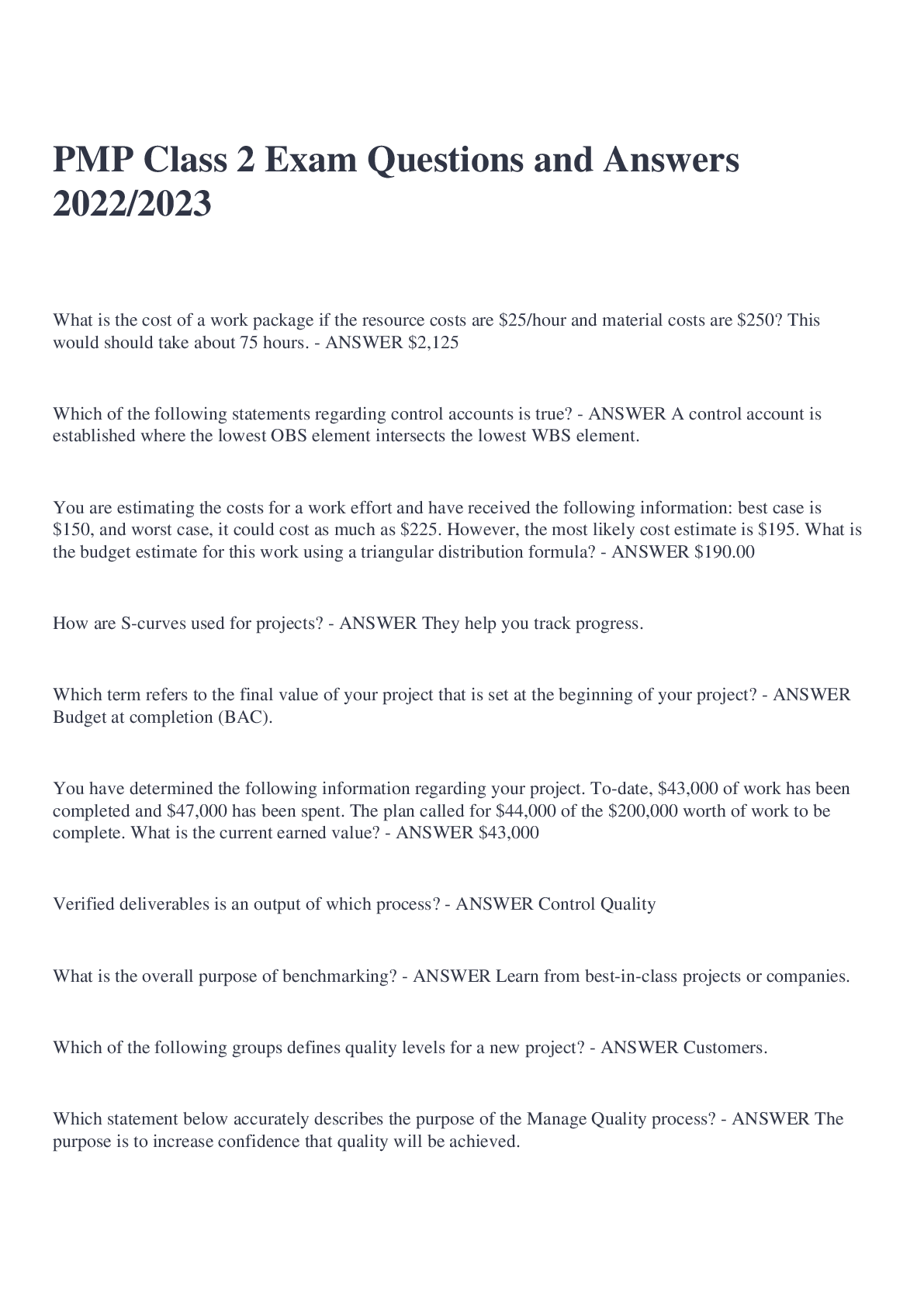 Management > EXAM > PMP Class 2 Exam Questions and Answers 2022/2023 (All)