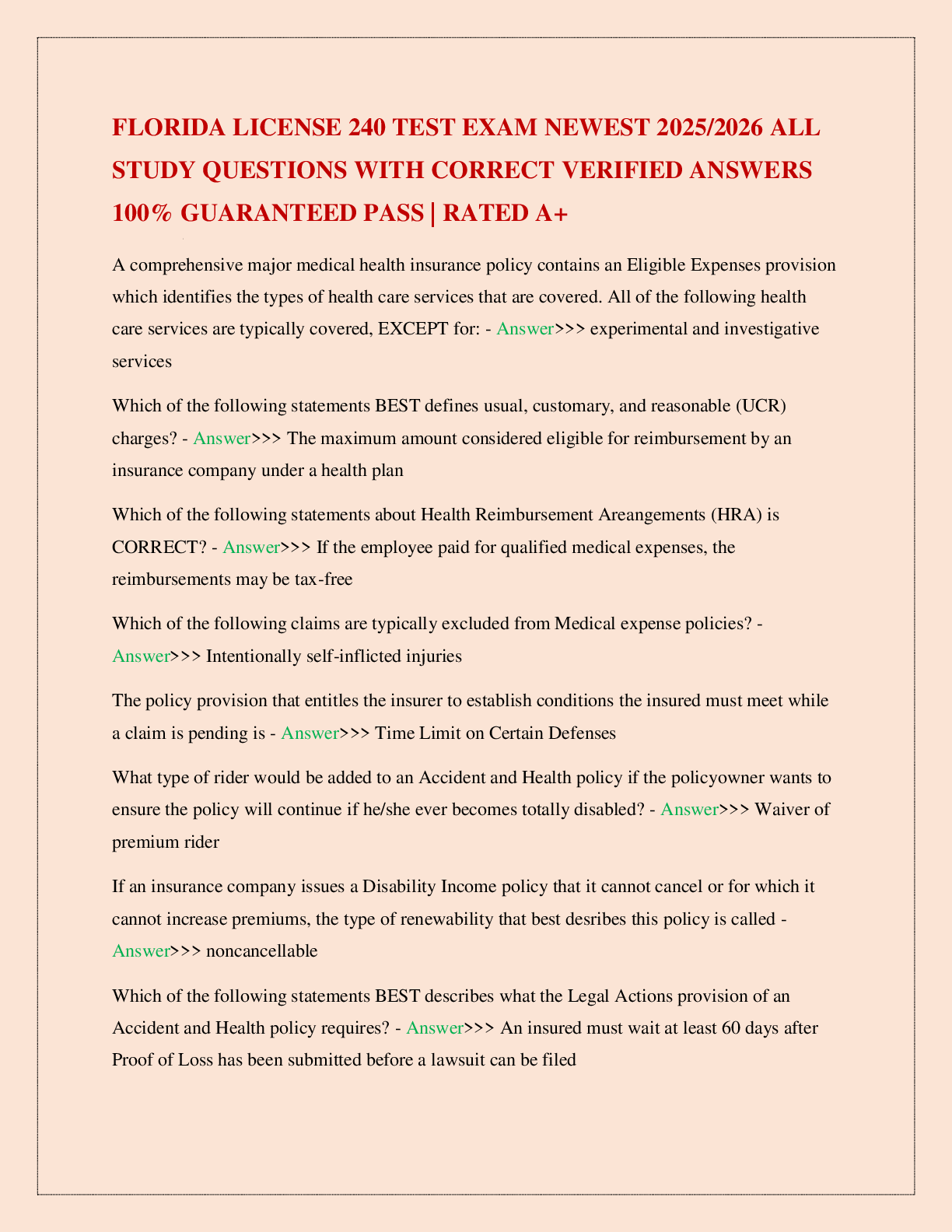 Management > EXAM > FLORIDA LICENSE 240 TEST EXAM NEWEST 2025/2026 ALL STUDY QUESTIONS WITH CORRECT VERIFIED ANSWERS 100% GUARANTEED PASS | RATED A+ (All)