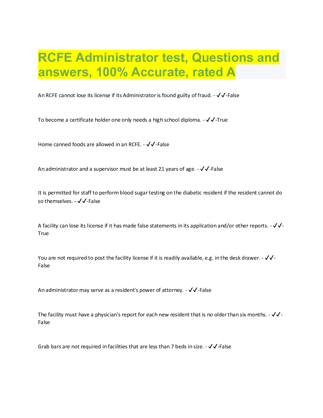 Management > QUESTIONS & ANSWERS > RCFE Administrator test, Questions and answers, 100% Accurate, rated A (All)