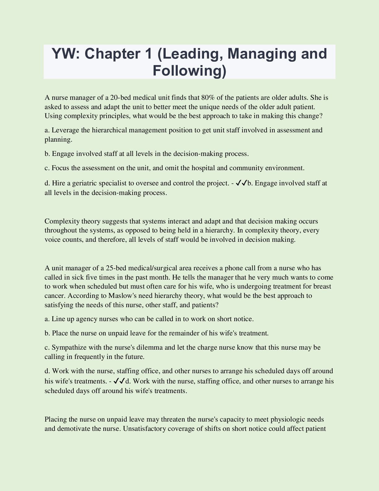 Management > EXAM > YW: Chapter 1 (Leading, Managing and Following) | Questions with 100% Correct Answers | Updated & Verified (All)