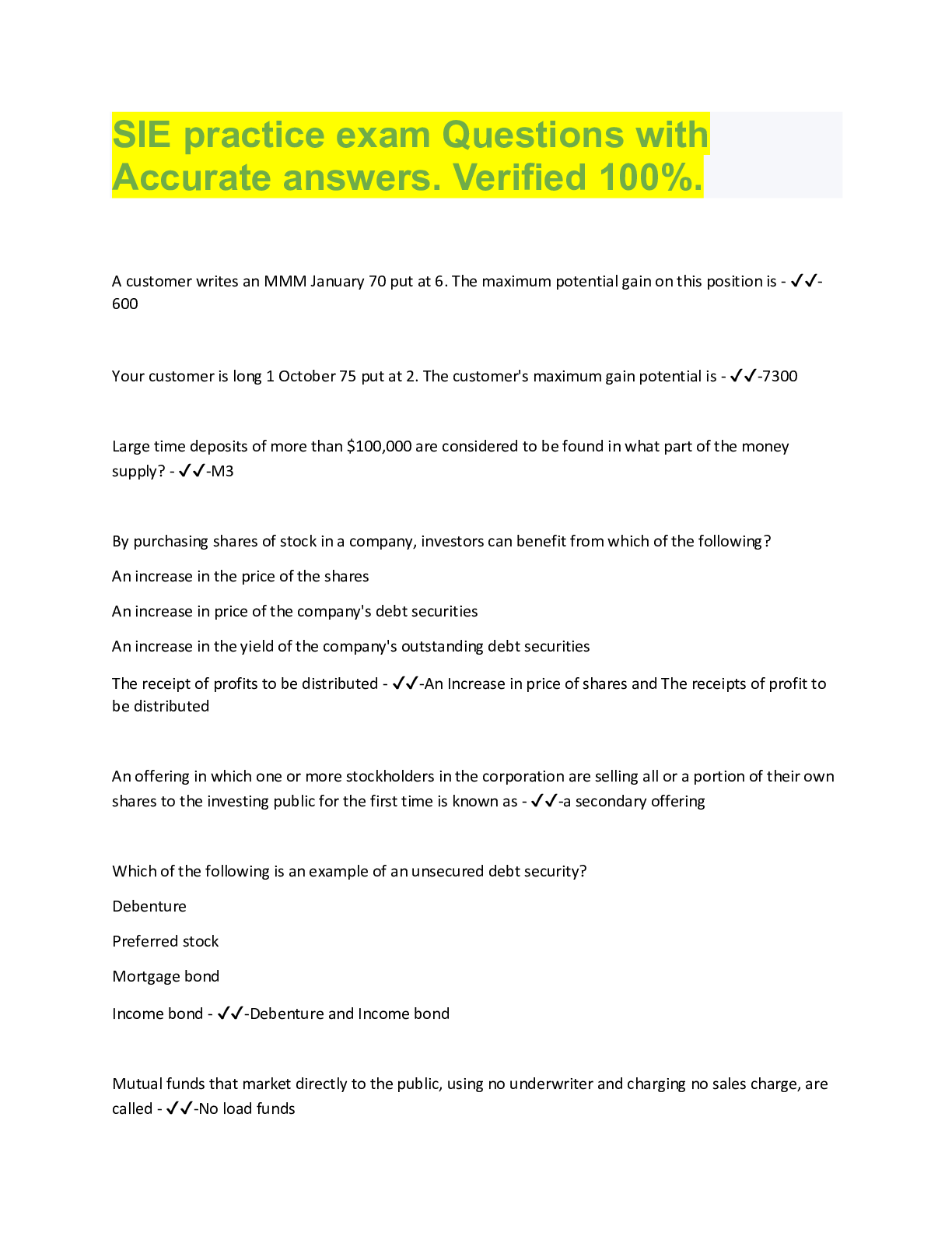 Management > QUESTIONS & ANSWERS > SIE Practice Exam Questions & Answers. Latest update, Graded A (All)