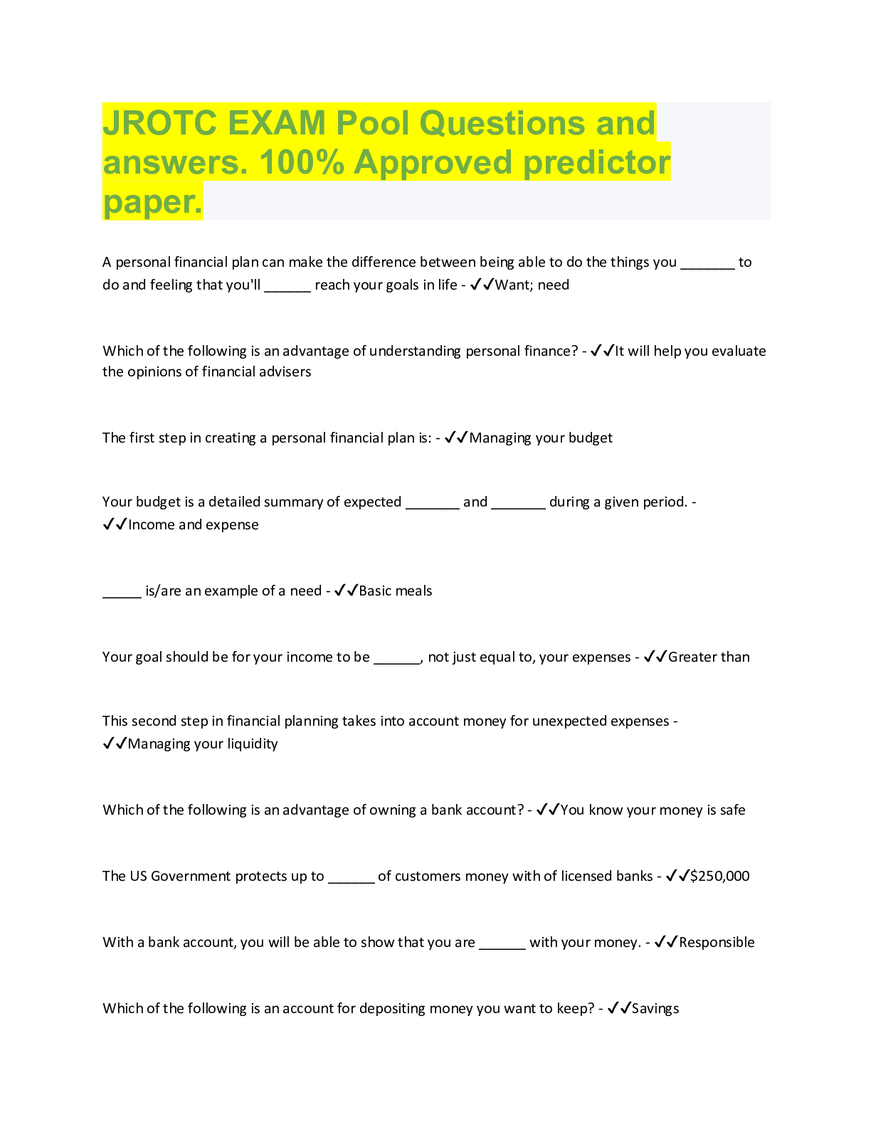 Management > QUESTIONS & ANSWERS > JROTC EXAM Pool Questions and answers. 100% Approved predictor paper. (All)