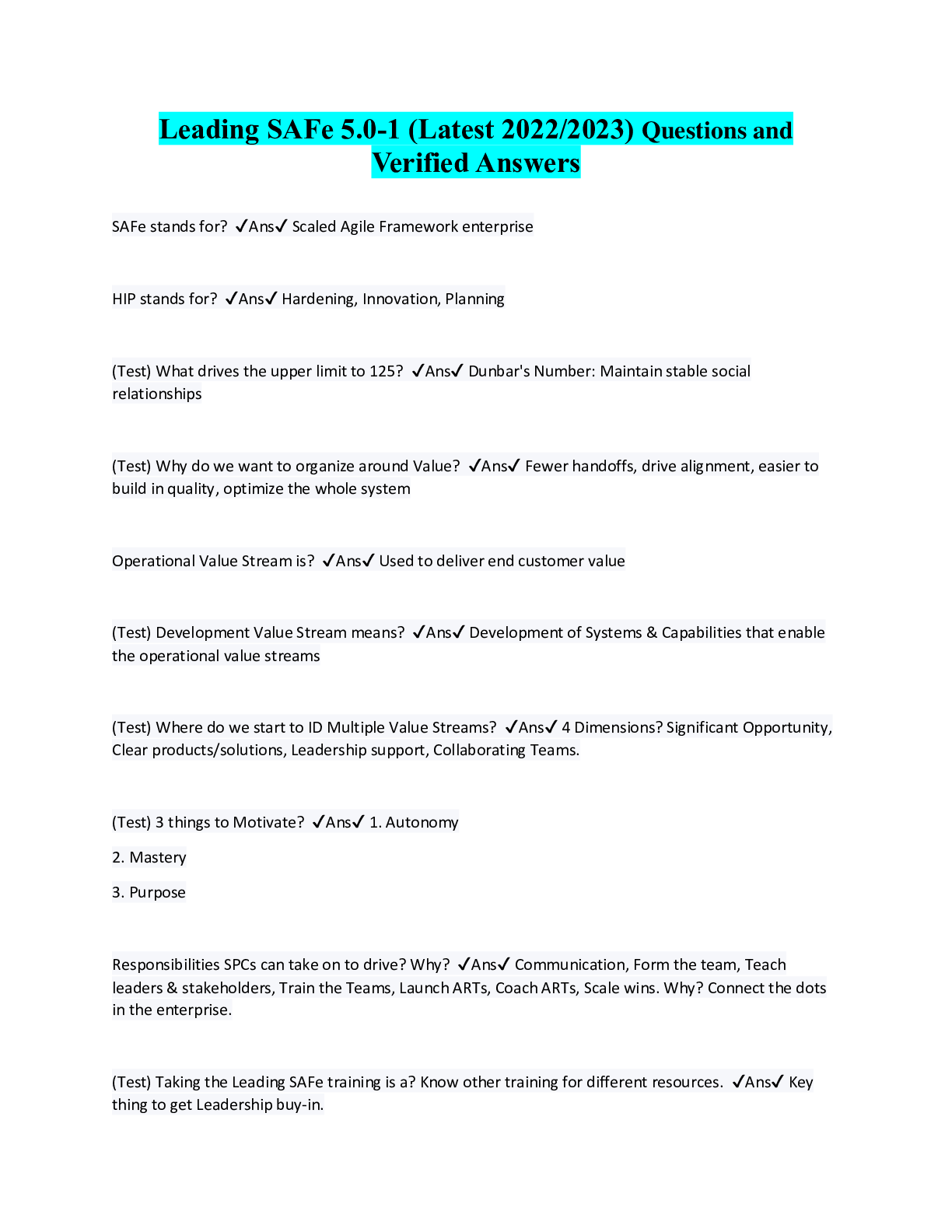 Management > QUESTIONS & ANSWERS > Leading SAFe 5.0-1 (Latest 2022/2023) Questions and Verified Answers (All)