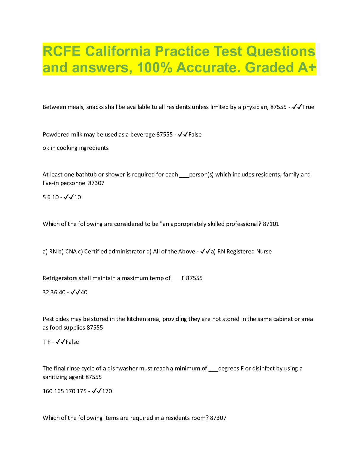 Management > QUESTIONS & ANSWERS > RCFE California Practice Test Questions and answers, 100% Accurate. Graded A+ (All)