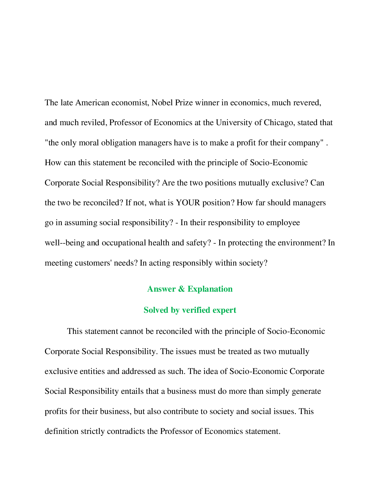 Management > QUESTIONS & ANSWERS > The late American economist, Nobel Prize winner in economics, much revered, and much reviled, Professor of Economics at the University of Chicago, stated that "the only moral obligation managers have is to make a profit for their company" . (All)