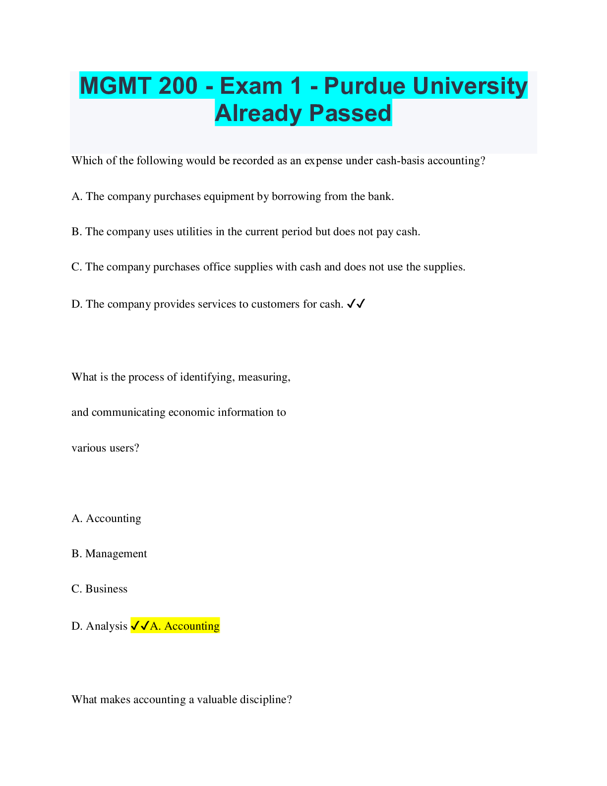 Management > QUESTIONS & ANSWERS > MGMT 200 - Exam 1 - Purdue University Already Passed (All)