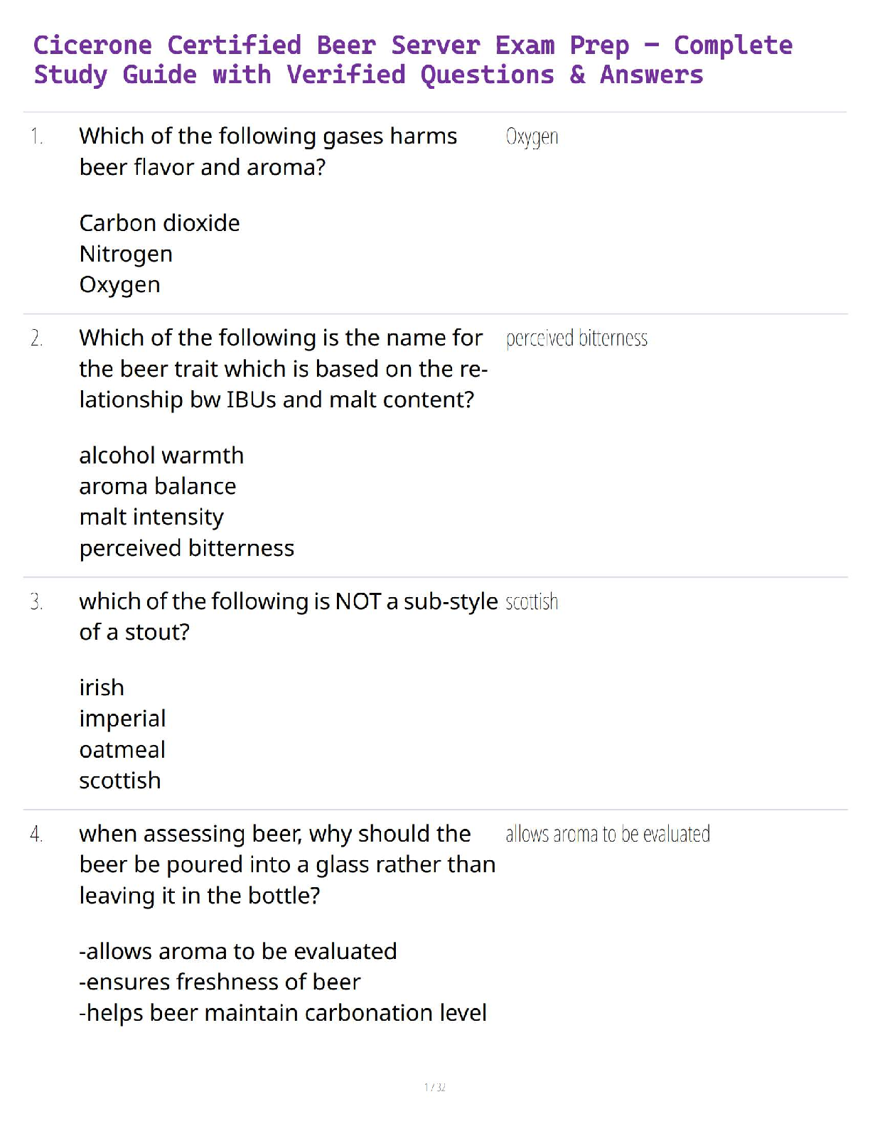 Responsible Beverage Service > QUESTIONS and ANSWERS > Cicerone Certified Beer Server Exam Prep – Complete Study Guide with Verified Questions & Answers (All)