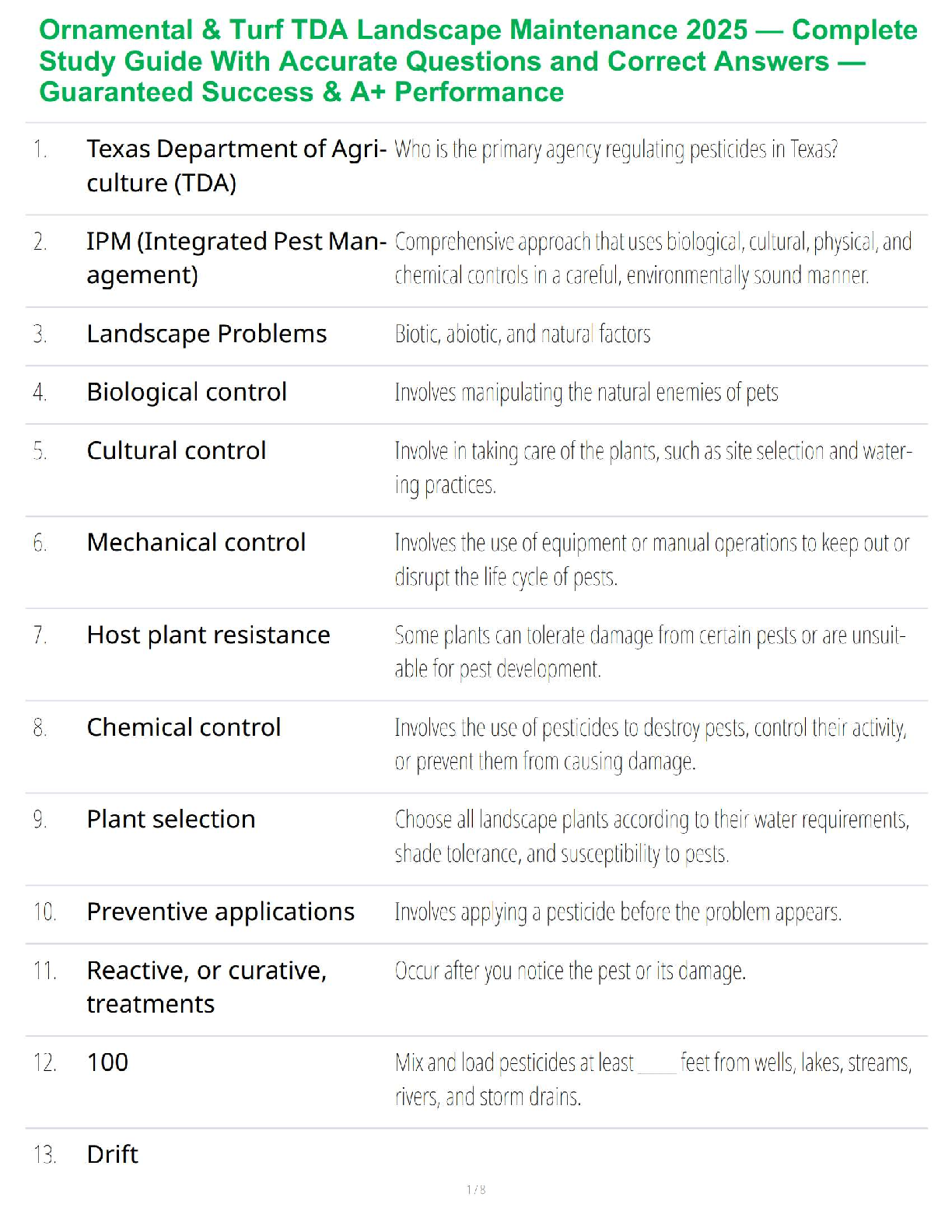 QAC Landscape and Maintenance > STUDY GUIDE > Ornamental & Turf TDA Landscape Maintenance 2025 — Complete Study Guide With Accurate Questions and Correct Answers — Guaranteed Success & A+ Performance (All)