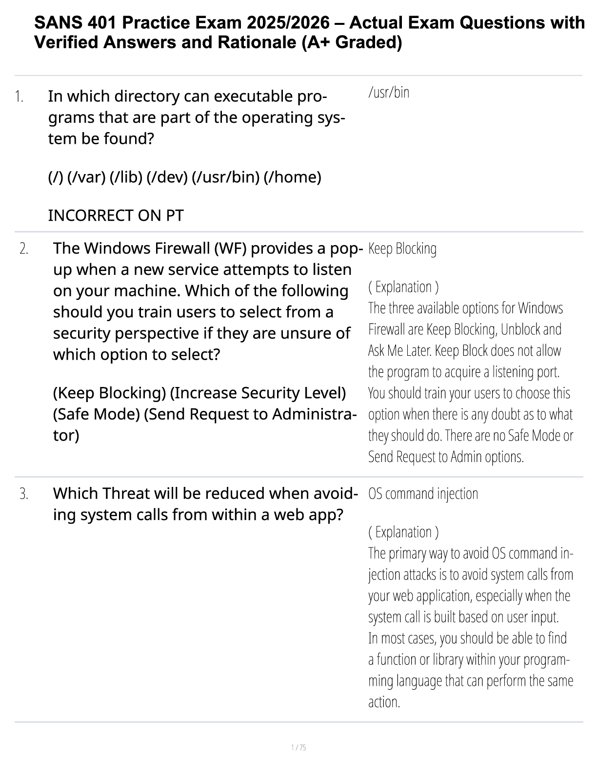 Computers and other technology > STUDY GUIDE > SANS 401 Practice Exam 2025/2026 – Actual Exam Questions with Verified Answers and Rationale (A+ Graded) (All)