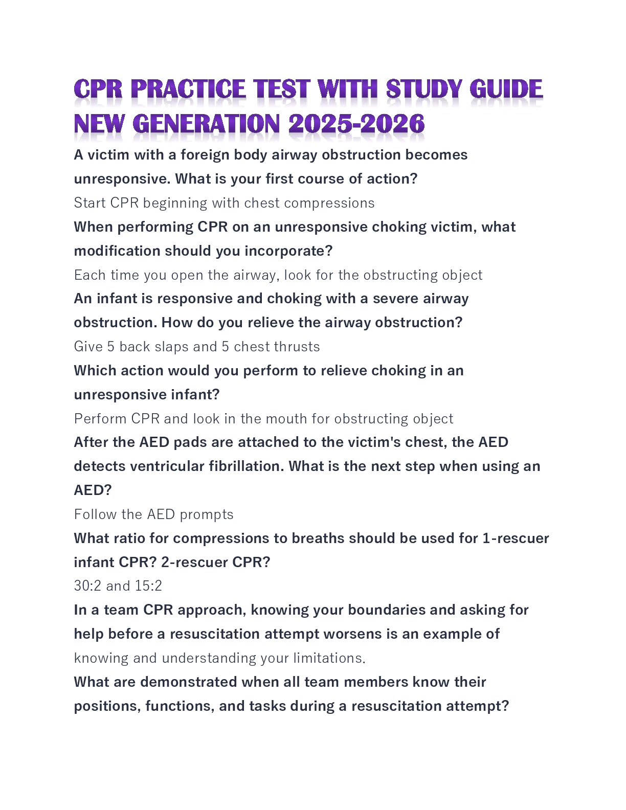 ASHI-CPR, AED, BFA > EXAM > CPR PRACTICE TEST WITH STUDY GUIDE NEW GENERATION 2025-2026 (All)
