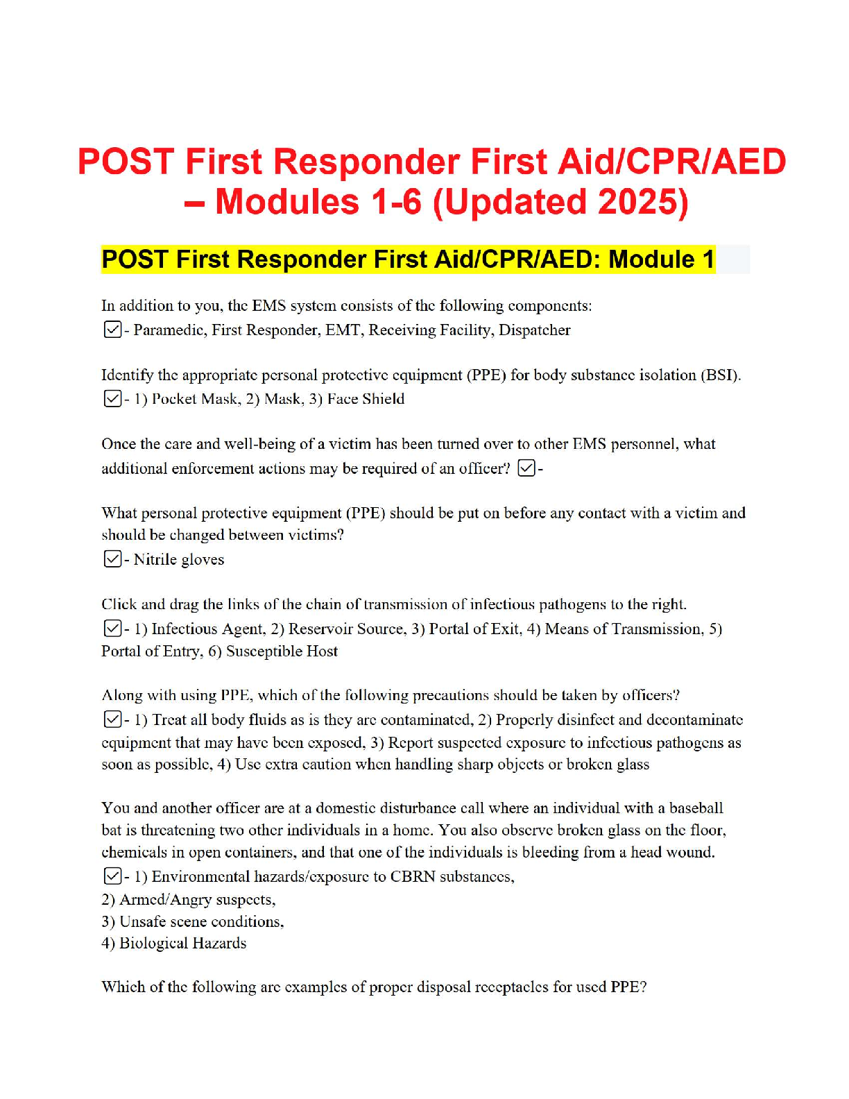 ASHI-CPR, AED, BFA > EXAM > 🚑 POST First Responder First Aid/CPR/AED – Modules 1-6 (Updated 2025) ✅ (All)