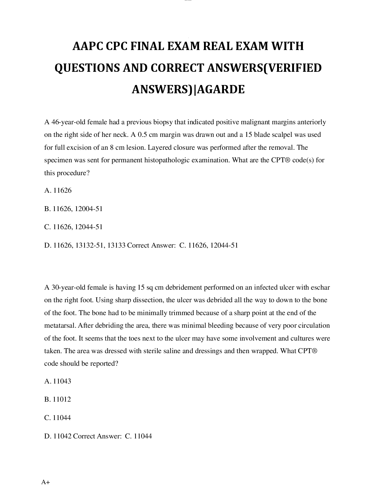 CPC > QUESTIONS & ANSWERS > AAPC CPC FINAL EXAM REAL EXAM WITH QUESTIONS AND CORRECT ANSWERS(VERIFIED ANSWERS)|AGARDE (All)